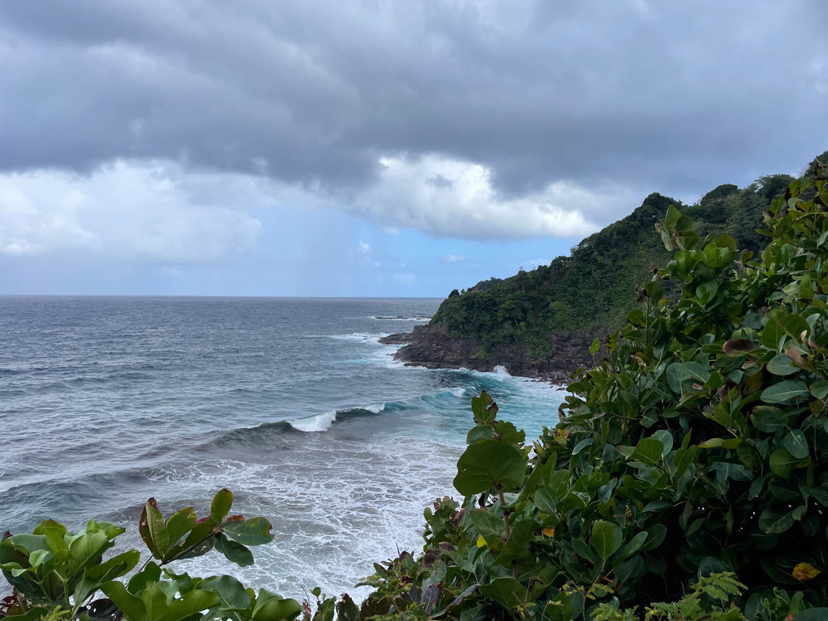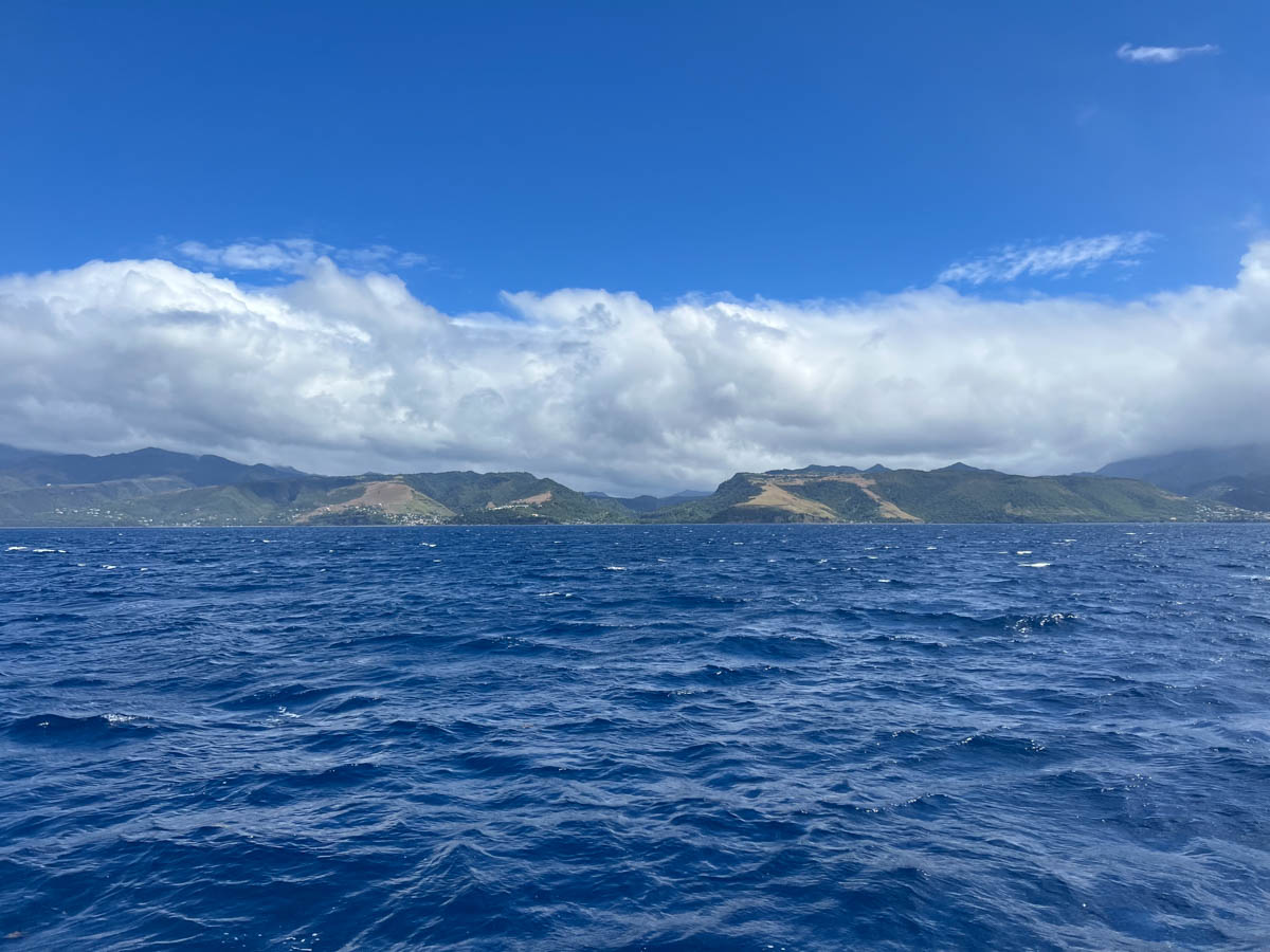 À l’abri de l’île, les vagues se calment mais des grains déferlent. Nous continuons à avancer à toute allure avec une pointe à 15 nœuds juste après le passage de la pointe. Après la pluie c’est calme plat pendant quelques dizaines de minutes alors nous relâchons les ris et nous nous demandons si on doit mettre le code zéro. Quand tout est sorti, évidemment le vent repart. On passe devant la capitale Roseau, Stardust nous avait déconseillé l’escale du fait des odeurs d’égout et effectivement à quelques miles de la ville on le sent déjà. Donc nous continuons vers le nord.