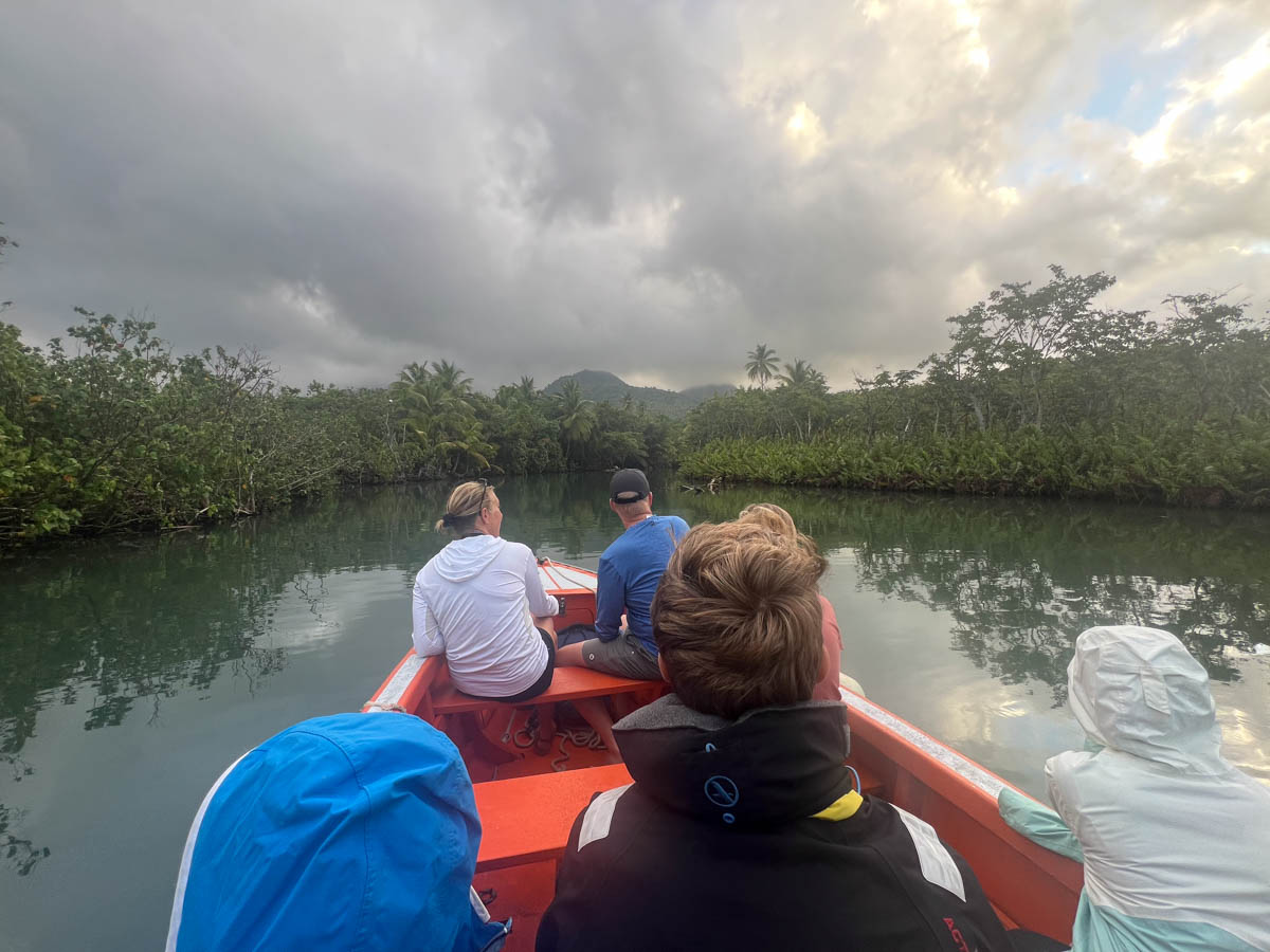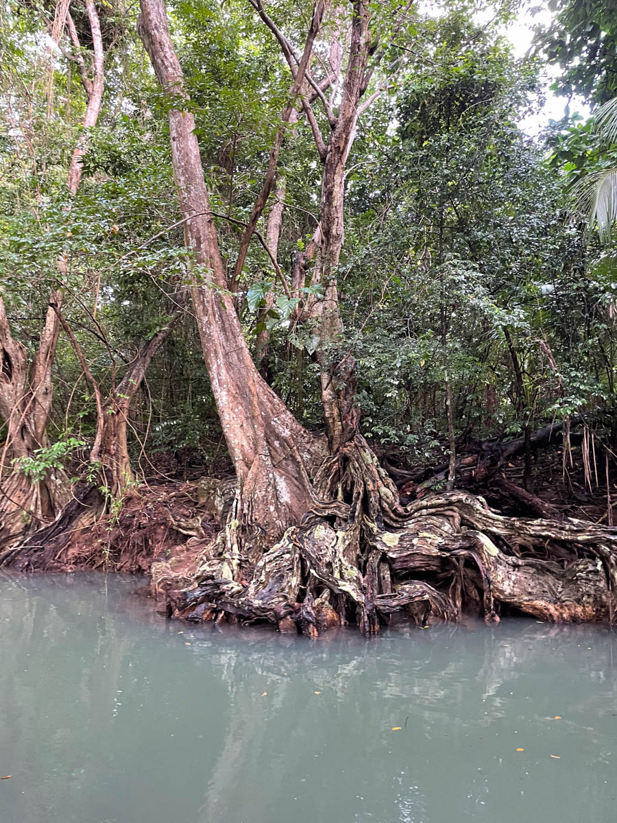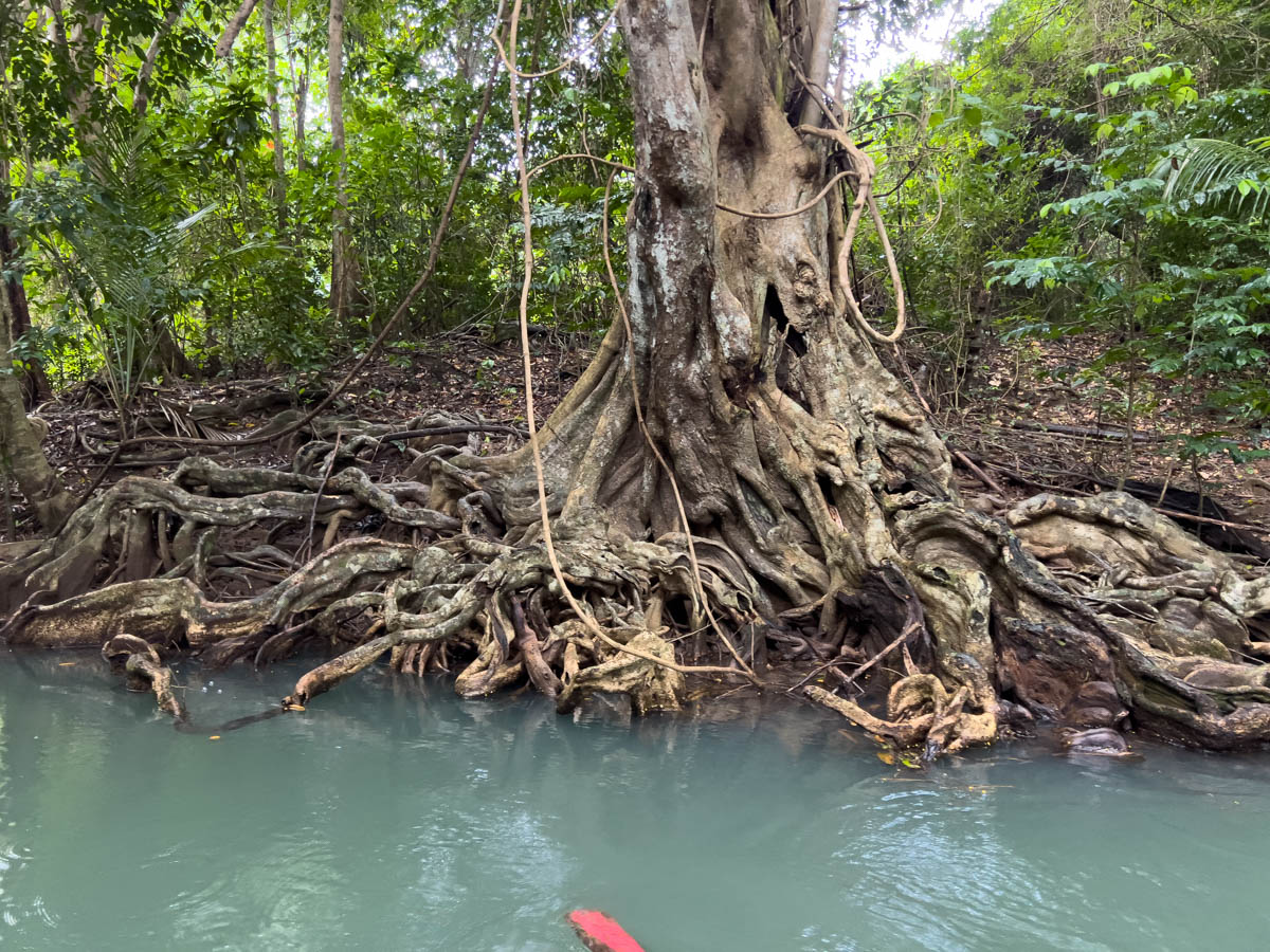 Jeudi 20 février nous sonnons le clairon à 6h30 car à 7h Elvis vient nous prendre dans son bateau à moteur pour visiter l’Indian River. C’est un fleuve saumâtre au milieu de la mangrove et de la forêt. Les indiens Kalinagos vivaient là avant d’être repoussés vers le nord ouest de l’île. Nous glissons sur les eaux calmes, Elvis nous montre les plantes, les oiseaux et les iguanes qui peuplent les lieux. Les racines des palétuviers sont impressionnantes. Nous débarquons dans un bar perdu dans la mangrove et continuons la découverte des fleurs exotiques dont le gingembre sauvage qui n’est que décoratif et l’hibiscus dont on fait du shampooing avec les feuilles. Au retour nous passons devant les lieux de tournage du film Pirates de Caraïbes 2 et 3, ça nous donne envie de les regarder ! Elvis nous explique aussi les ravages de l’ouragan Maria en 2017. Tous les toits se sont envolés et les branches hautes des arbres aussi. La voûte végétale au-dessus de la rivière se reconstitue progressivement.