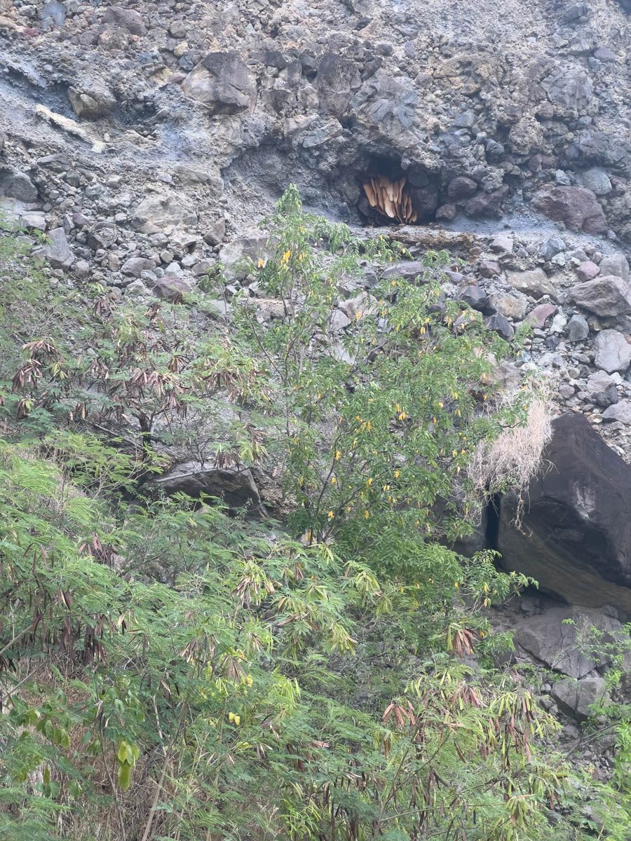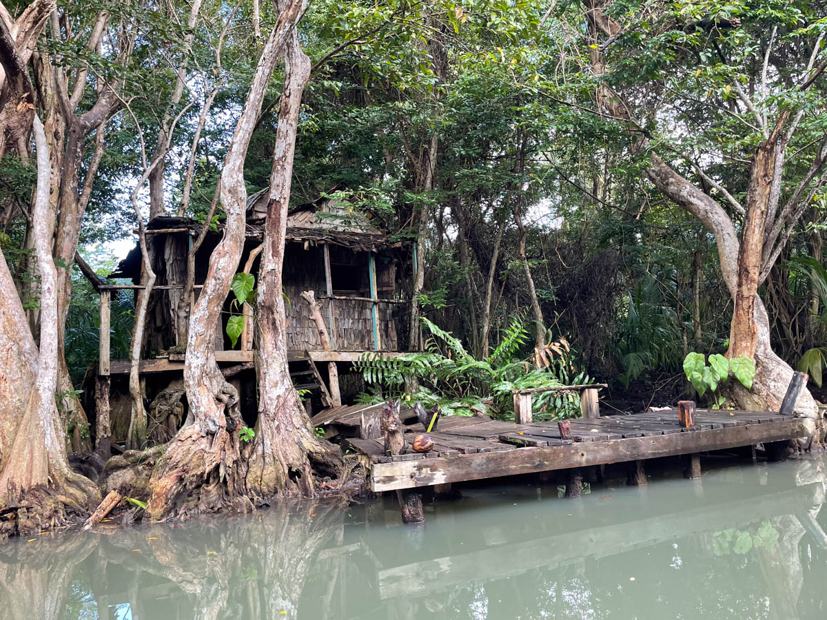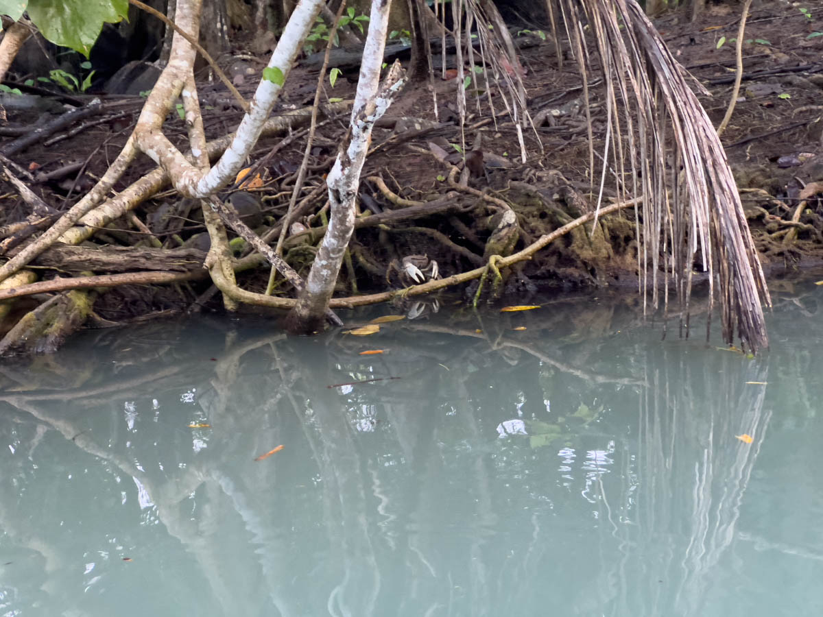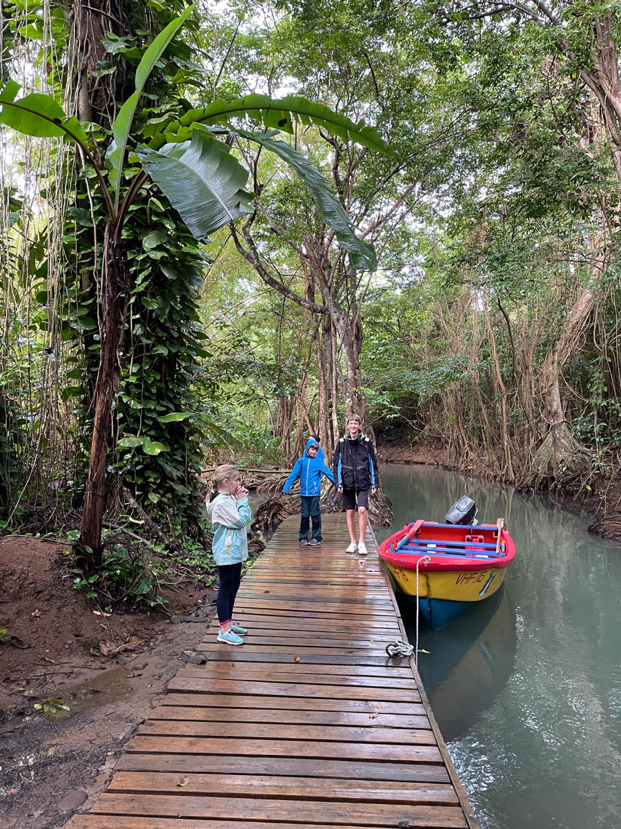 Jeudi 20 février nous sonnons le clairon à 6h30 car à 7h Elvis vient nous prendre dans son bateau à moteur pour visiter l’Indian River. C’est un fleuve saumâtre au milieu de la mangrove et de la forêt. Les indiens Kalinagos vivaient là avant d’être repoussés vers le nord ouest de l’île. Nous glissons sur les eaux calmes, Elvis nous montre les plantes, les oiseaux et les iguanes qui peuplent les lieux. Les racines des palétuviers sont impressionnantes. Nous débarquons dans un bar perdu dans la mangrove et continuons la découverte des fleurs exotiques dont le gingembre sauvage qui n’est que décoratif et l’hibiscus dont on fait du shampooing avec les feuilles. Au retour nous passons devant les lieux de tournage du film Pirates de Caraïbes 2 et 3, ça nous donne envie de les regarder ! Elvis nous explique aussi les ravages de l’ouragan Maria en 2017. Tous les toits se sont envolés et les branches hautes des arbres aussi. La voûte végétale au-dessus de la rivière se reconstitue progressivement.