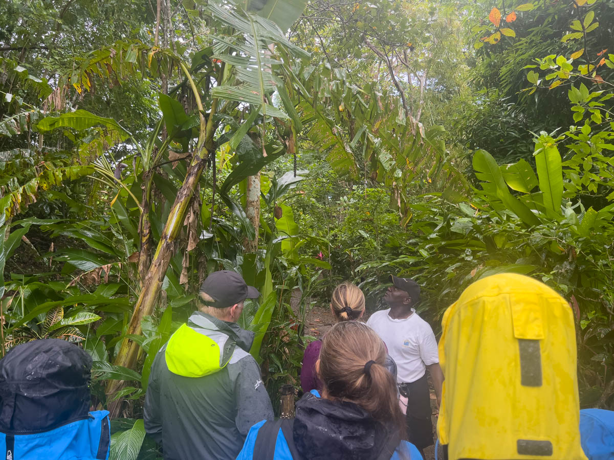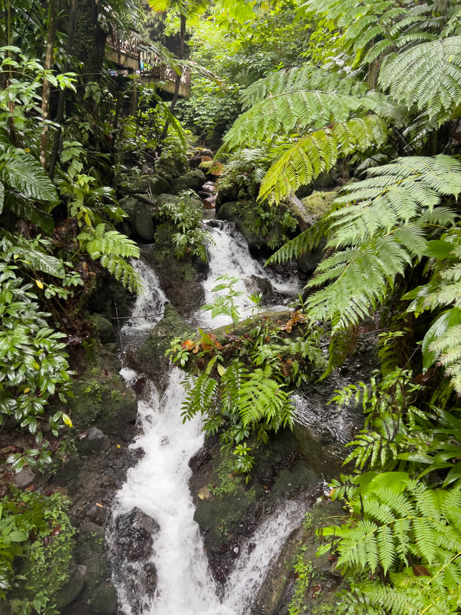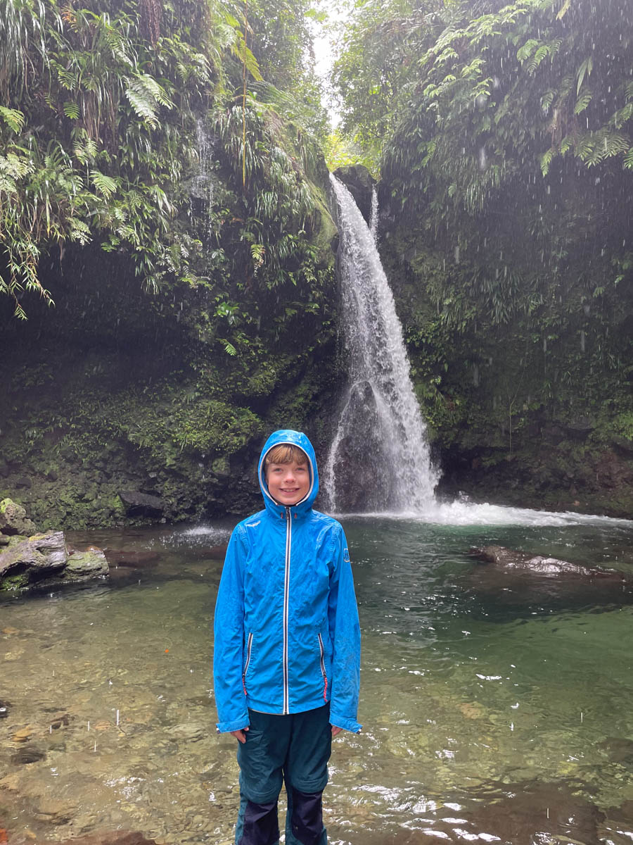 La route monte en lacet dans les montagnes. Arlington nous présente son île aux 365 rivières. L’eau est partout et d’ailleurs il pleut abondamment. À part le tourisme l’île produit beaucoup de fruits et légumes qu’ils exportent dans les îles voisines. Les routes sont entretenues par chaque village, ce qui donne du travail aux personnes au chômage. Nous voyons des équipes payées par le gouvernement qui coupent les herbes et plantent des arbustes et fleurs colorées. Nous grimpons dans la montagne jusqu’à l’entrée d’une première cascade aménagée. Nous payons quelques dollars caribéens pour accéder à un escalier qui s’enfonce dans la forêt. En quelques minutes nous arrivons en bas d’une belle cascade où on peut se baigner. Mais la pluie nous dissuade de sortir les maillots de bain. Nous restons à l’abri de nos cirés à admirer le paysage naturel verdoyant et humide.