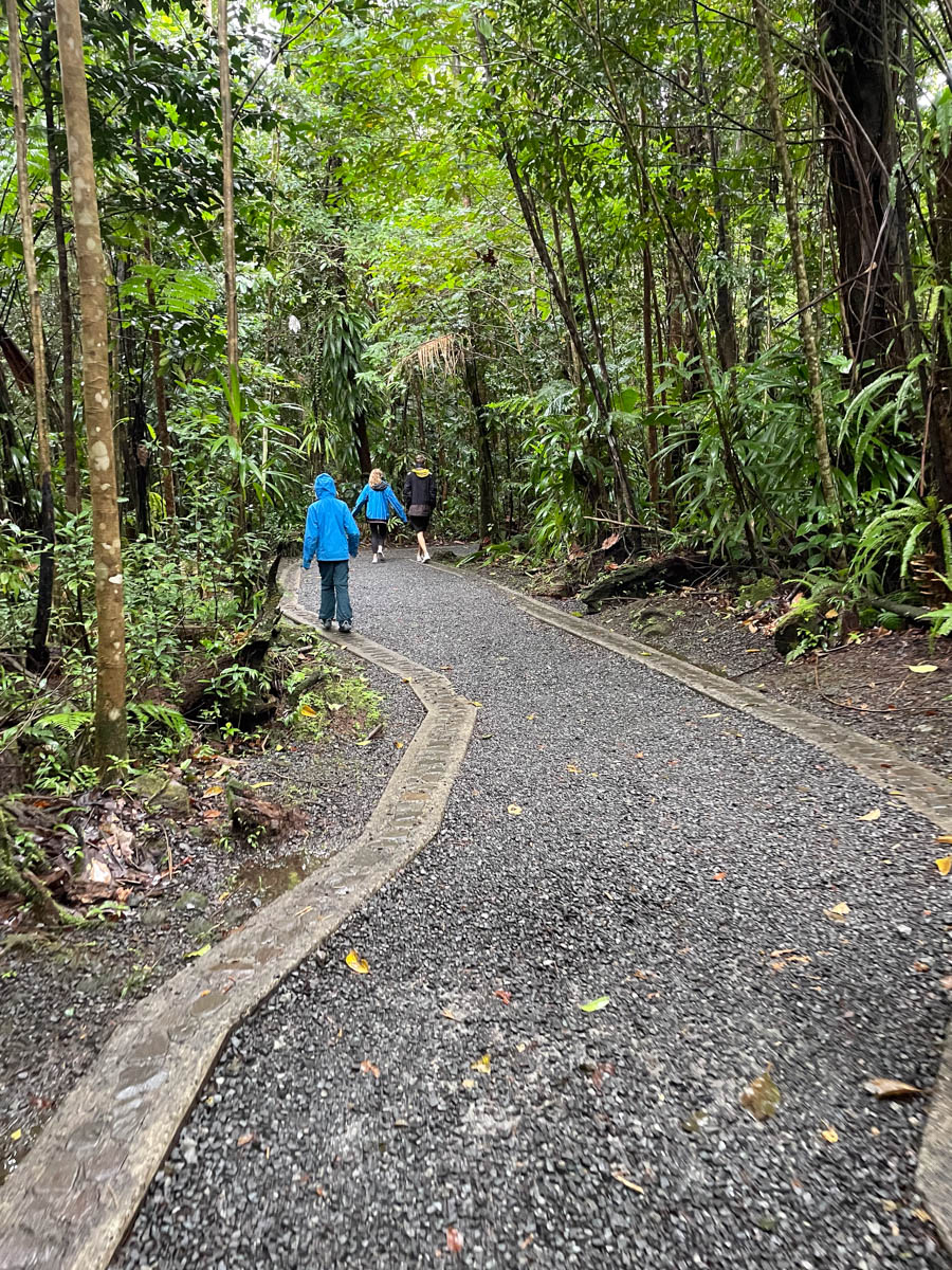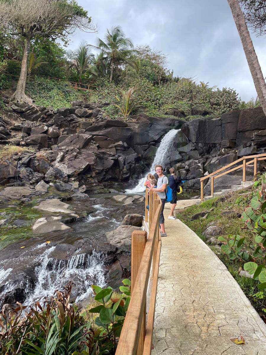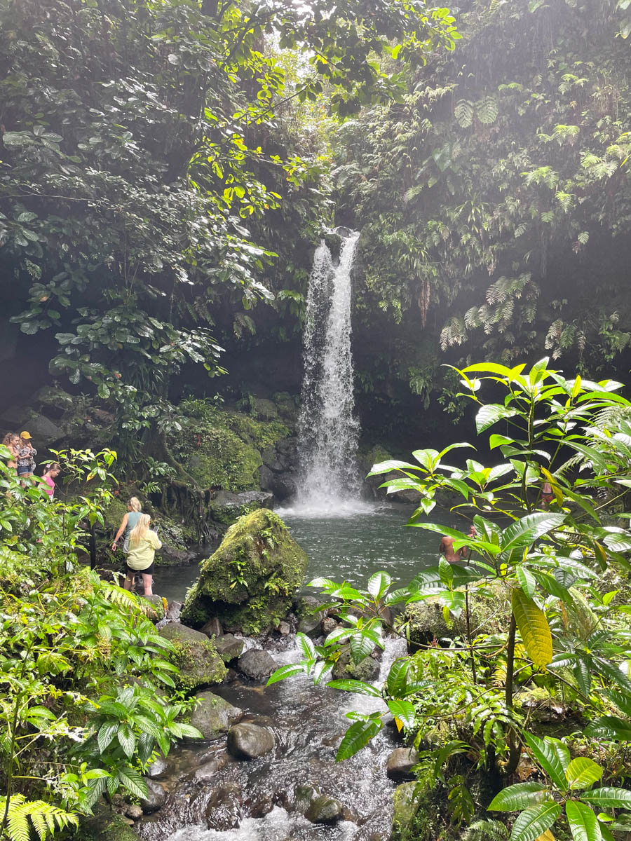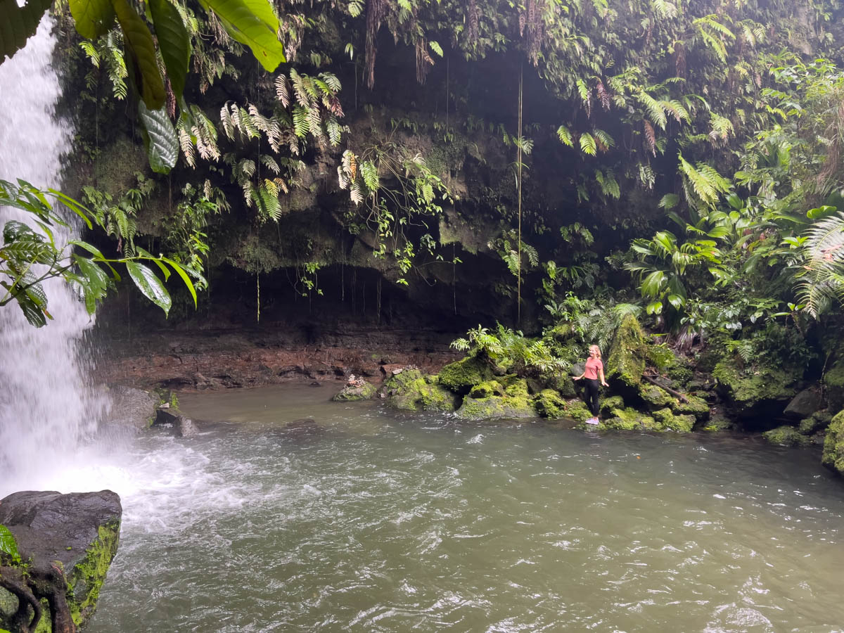 Nous remontons en voiture et étalons nos manteaux. Il ne fait pas froid mais c’est humide. Nous atteignons ensuite la célèbre Emerald Pool. Le billet de l’Indian River est aussi valable ici. Nous marchons sur un joli chemin aménagé jusqu’à la cascade. La pluie s’est arrêtée et cette fois nous sommes super motivés pour nous baigner. Nous nous changeons sur les pierres et nous descendons dans la piscine au milieu des plantes luxuriantes. L’eau est fraîche et le courant de la chute d’eau impressionnant. Mais on est très fier d’avoir fait cette expérience !