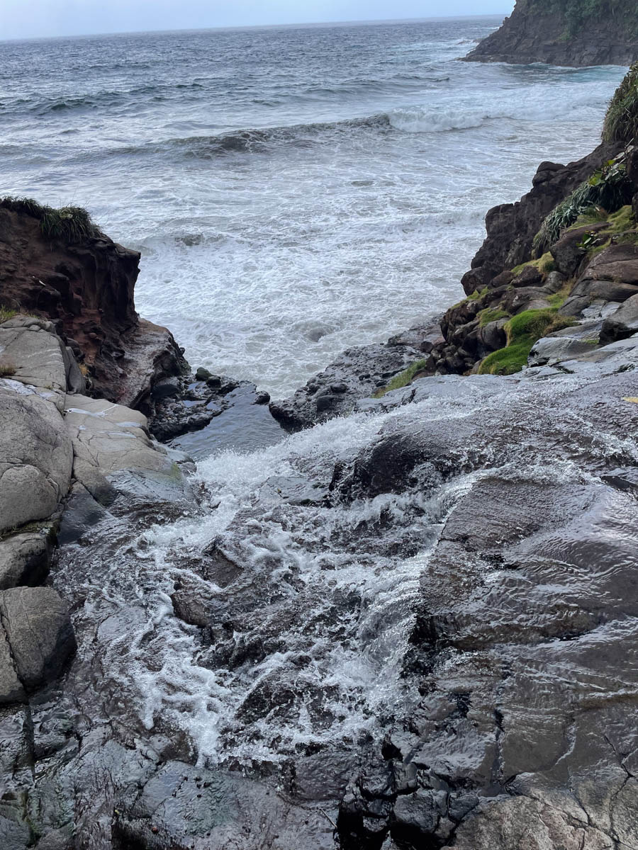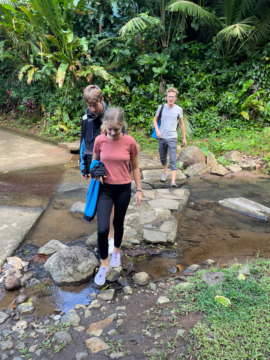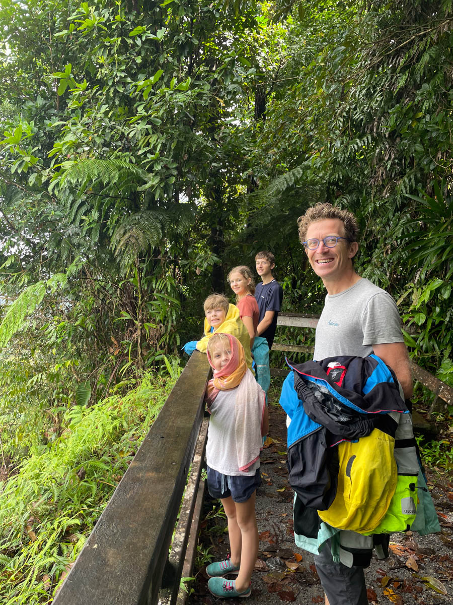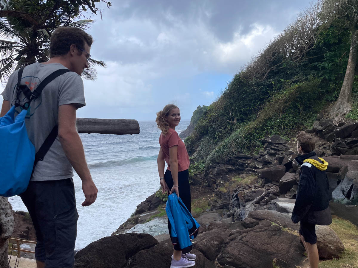 Nous remontons en voiture et étalons nos manteaux. Il ne fait pas froid mais c’est humide. Nous atteignons ensuite la célèbre Emerald Pool. Le billet de l’Indian River est aussi valable ici. Nous marchons sur un joli chemin aménagé jusqu’à la cascade. La pluie s’est arrêtée et cette fois nous sommes super motivés pour nous baigner. Nous nous changeons sur les pierres et nous descendons dans la piscine au milieu des plantes luxuriantes. L’eau est fraîche et le courant de la chute d’eau impressionnant. Mais on est très fier d’avoir fait cette expérience !