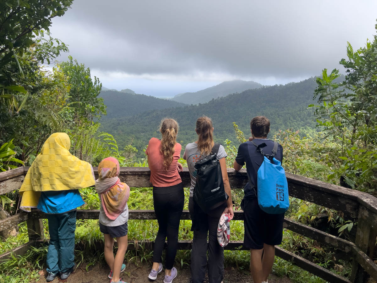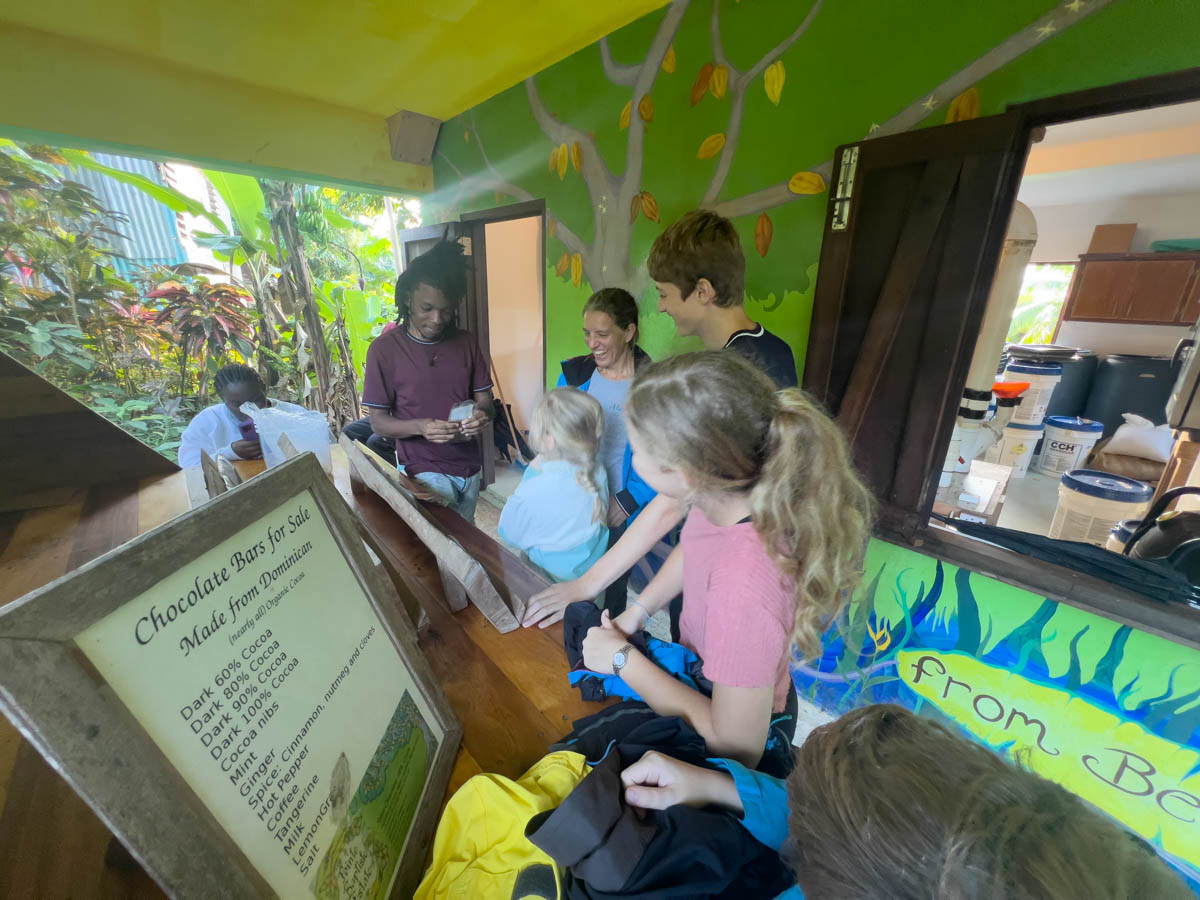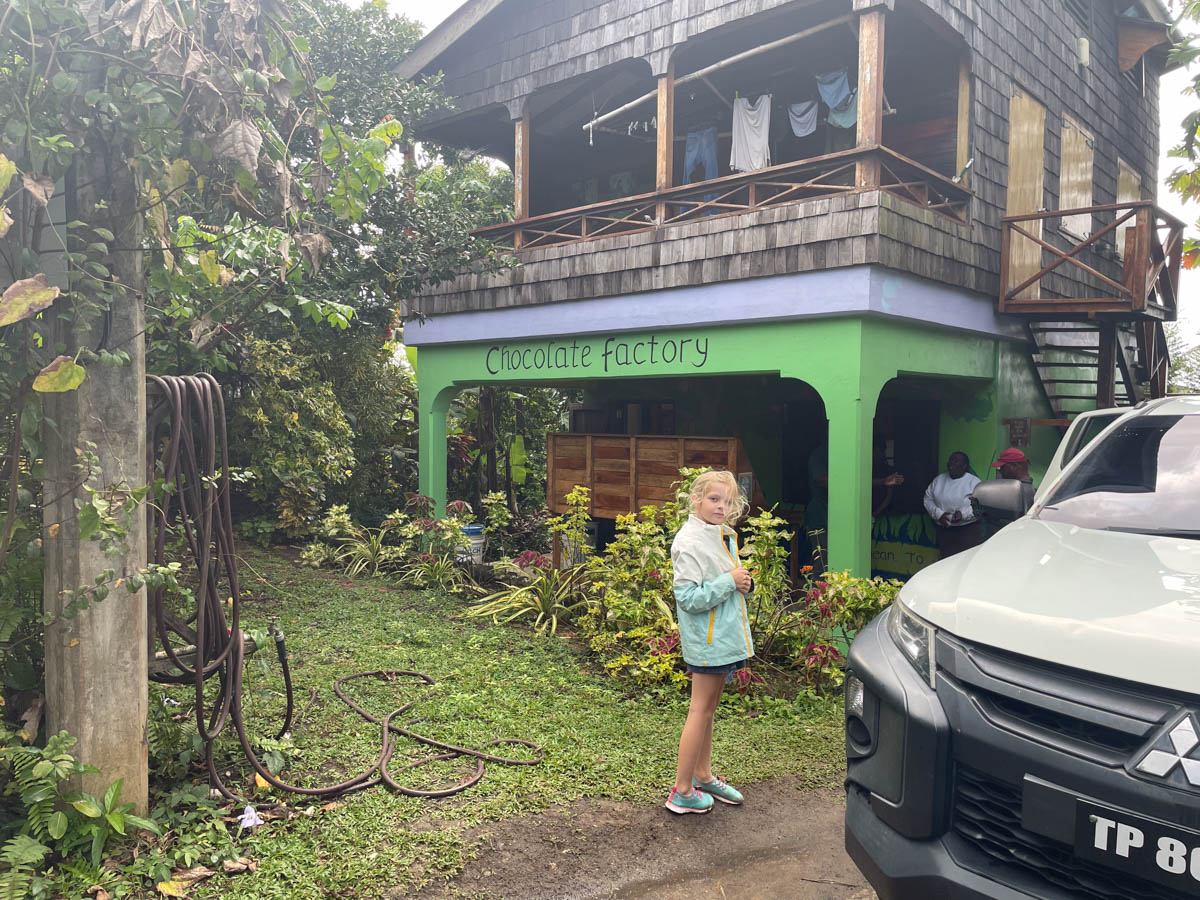 Elvis nous dépose au ponton et nous présente Arlington qui va nous faire faire un tour de l’île dans son minibus. Il nous propose un programme de visites : cascades, village des indiens et chocolat.