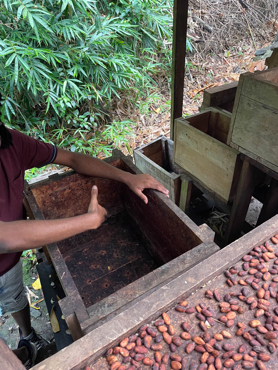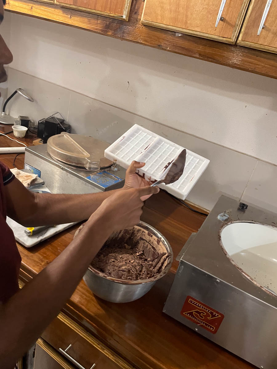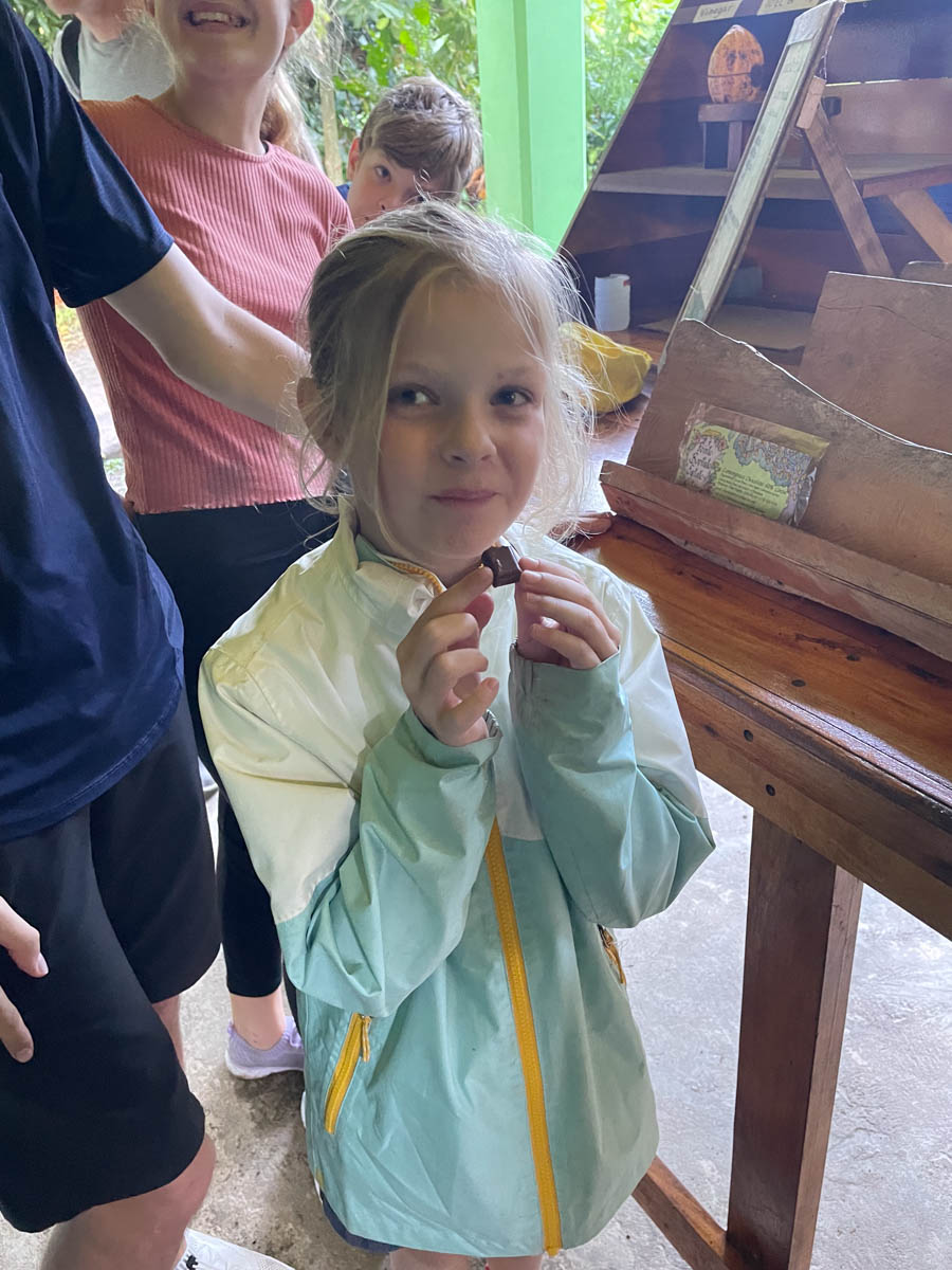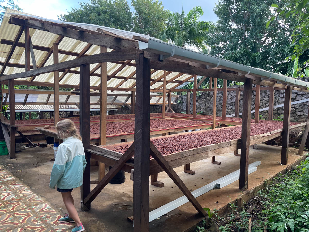 Notre dernière étape est la visite de la « Chocolate Factory ». Un producteur local a développé un atelier de chocolat. Un jeune homme nous explique tout le processus. D’abord la plantation des cacaotiers avec les minuscules fleurs qui se transforment en cabosses en 6 mois. Quand les cabosses sont mûres (jaunes), ils extraient les fèves et les mettent dans une grande caisse percée. Les fèves ferment pendant une semaine. Il faut les brasser régulièrement pour homogénéiser la température. Le vinaigre de chocolat est récupéré à travers les trous de la caisse. Quand la température se stabilise il est temps de faire sécher les fèves au soleil mais protégées de la pluie sur de grands plateaux. Au bout de quelques jours les fèves sont prêtes pour la fabrication du chocolat. Tout d’abord les fèves sont torréfiées à 120 degrés pendant 45 minutes dans une étuve. Puis elles sont broyées grossièrement et la peau plus légère est aspirée. Ils vendent la peau en tisane car rien ne se perd. Ensuite la poudre est malaxée à une température bien précise et pendant plusieurs heures pour former la pâte de cacao. Additionnée de sucre et de différents arômes, la pâte de cacao est refroidie de manière très contrôlée jusqu’à la température où elle cristallise en mono-cristaux qui font le chocolat onctueux comme on l’aime puis coulée dans des moules de tablette. Enfin les tablettes refroidissent lentement et sont démoulées et empaquetées. Dans cet atelier ils fabriquent 20 000 tablettes par an d’une dizaine de parfums. Nous apprécions grandement la dégustation et repartons avec nos coups de cœur : chocolat lait, chocolat orange, chocolat salé et chocolat avec des morceaux de fèves.