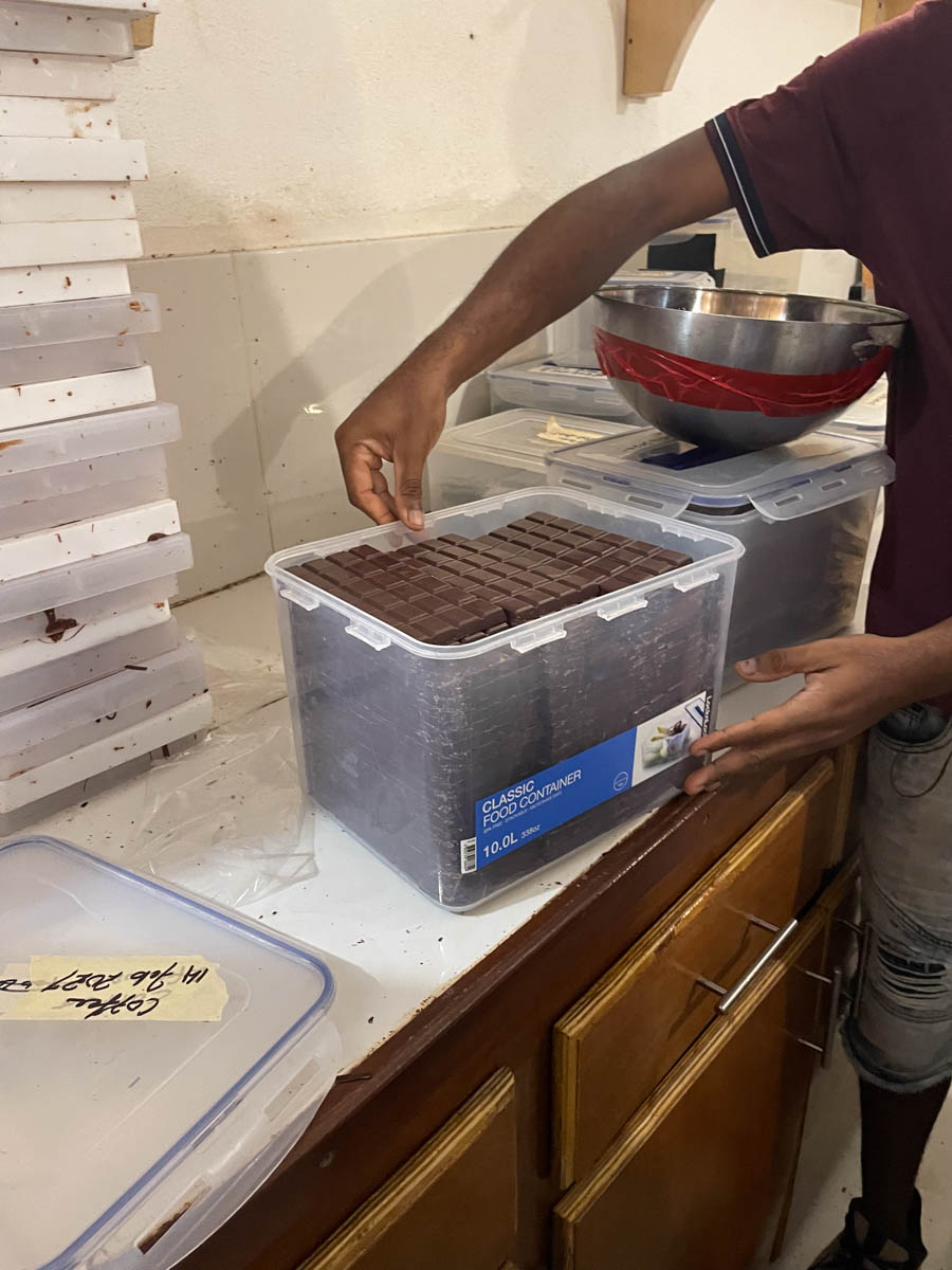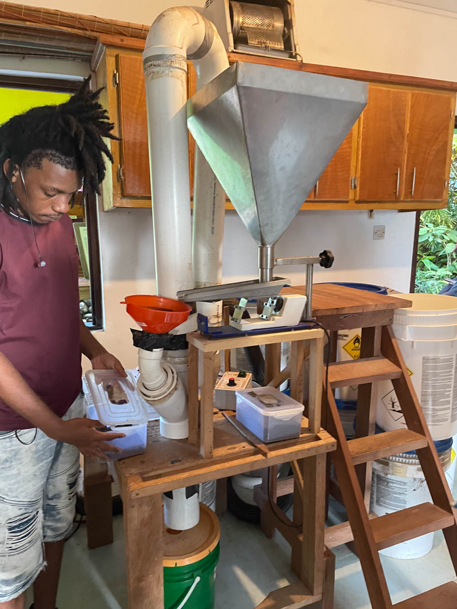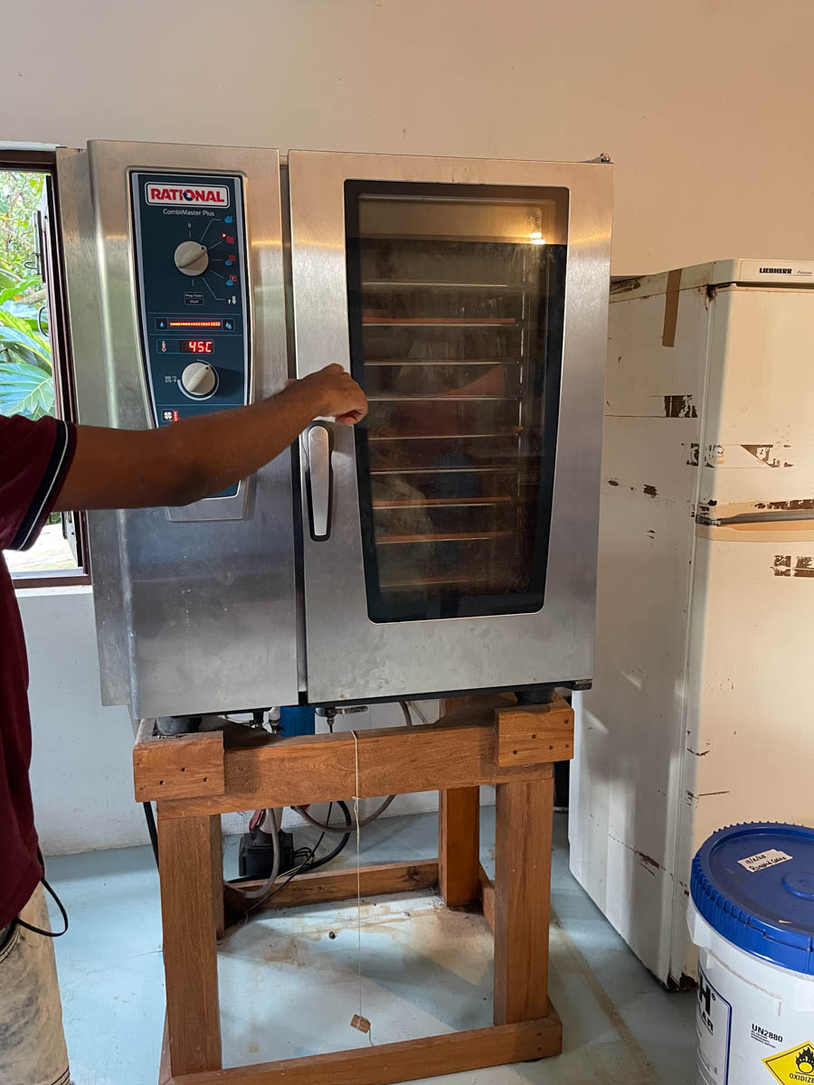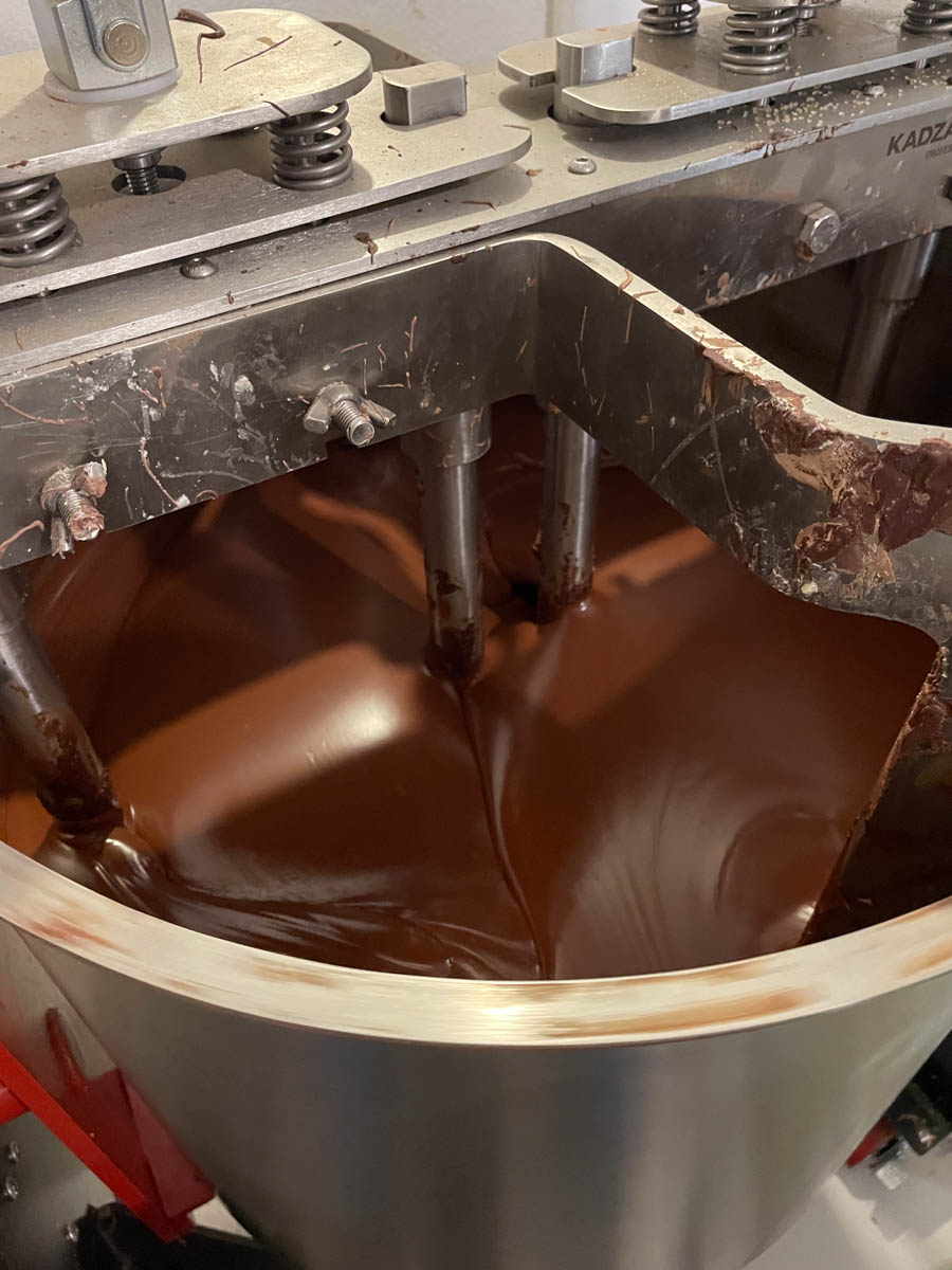Notre dernière étape est la visite de la « Chocolate Factory ». Un producteur local a développé un atelier de chocolat. Un jeune homme nous explique tout le processus. D’abord la plantation des cacaotiers avec les minuscules fleurs qui se transforment en cabosses en 6 mois. Quand les cabosses sont mûres (jaunes), ils extraient les fèves et les mettent dans une grande caisse percée. Les fèves ferment pendant une semaine. Il faut les brasser régulièrement pour homogénéiser la température. Le vinaigre de chocolat est récupéré à travers les trous de la caisse. Quand la température se stabilise il est temps de faire sécher les fèves au soleil mais protégées de la pluie sur de grands plateaux. Au bout de quelques jours les fèves sont prêtes pour la fabrication du chocolat. Tout d’abord les fèves sont torréfiées à 120 degrés pendant 45 minutes dans une étuve. Puis elles sont broyées grossièrement et la peau plus légère est aspirée. Ils vendent la peau en tisane car rien ne se perd. Ensuite la poudre est malaxée à une température bien précise et pendant plusieurs heures pour former la pâte de cacao. Additionnée de sucre et de différents arômes, la pâte de cacao est refroidie de manière très contrôlée jusqu’à la température où elle cristallise en mono-cristaux qui font le chocolat onctueux comme on l’aime puis coulée dans des moules de tablette. Enfin les tablettes refroidissent lentement et sont démoulées et empaquetées. Dans cet atelier ils fabriquent 20 000 tablettes par an d’une dizaine de parfums. Nous apprécions grandement la dégustation et repartons avec nos coups de cœur : chocolat lait, chocolat orange, chocolat salé et chocolat avec des morceaux de fèves.