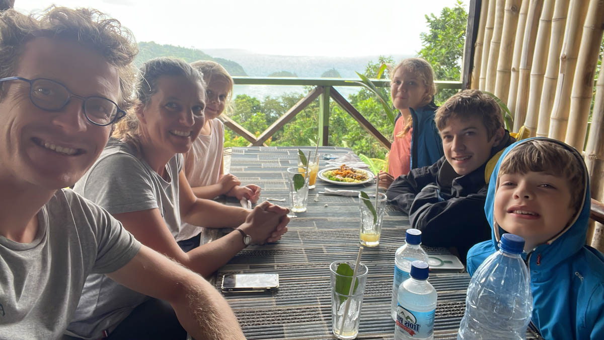 Nous traversons la montagne vers l’est pour aller déjeuner sur la côte -Atlantique. Arlington nous dépose à un petit restaurant improbable mais avec une vue superbe sur l’océan. Nous dégustons en entrée des frites de bananes plantain avec une sauce au curry délicieuse puis du poulet, du colombo et du poisson accompagnés de légumes variés. C’est épicé mais revigorant.