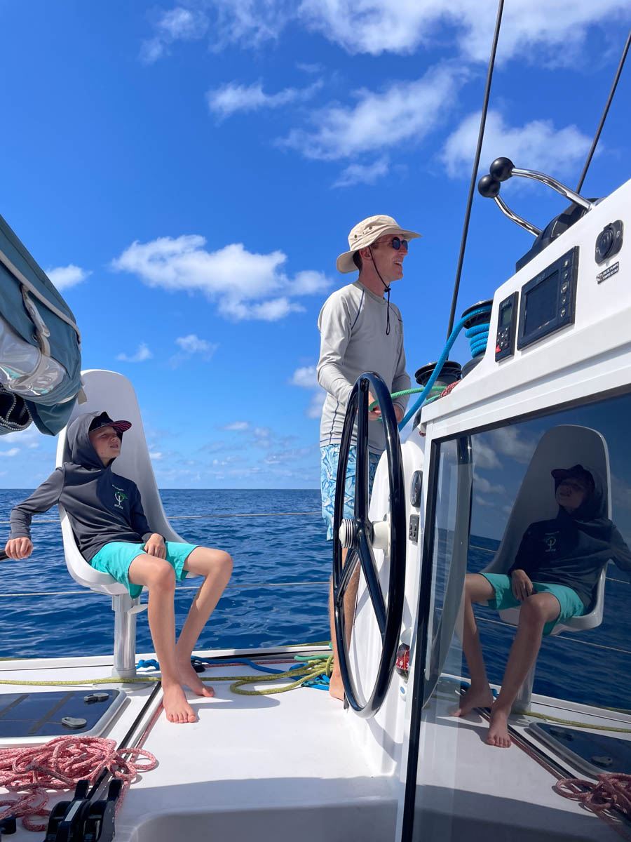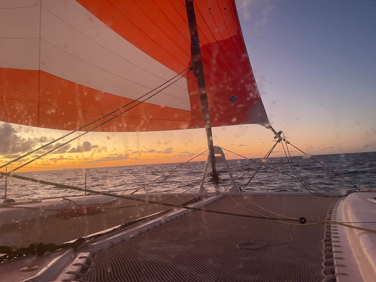 Nous passons dans le sillage de la Soufrière entre 22h45 et 23h30 au moteur du fait de l’absence de vent. Puis le vent revient progressivement puis forcit au point de devoir à nouveau rouler le gennaker. Vers 1h30, le vent se stabilise enfin à l’ENE autour de 15nds et Antoine réveille les ados à 1h30 du matin pour leur quart. Le vent reste ensuite stable pour la nuit et nous avançons à bonne allure jusqu’au petit matin où le vent adonne et nous pouvons redérouler le gennaker. Nous sommes nettement au-dessus de 8nds.