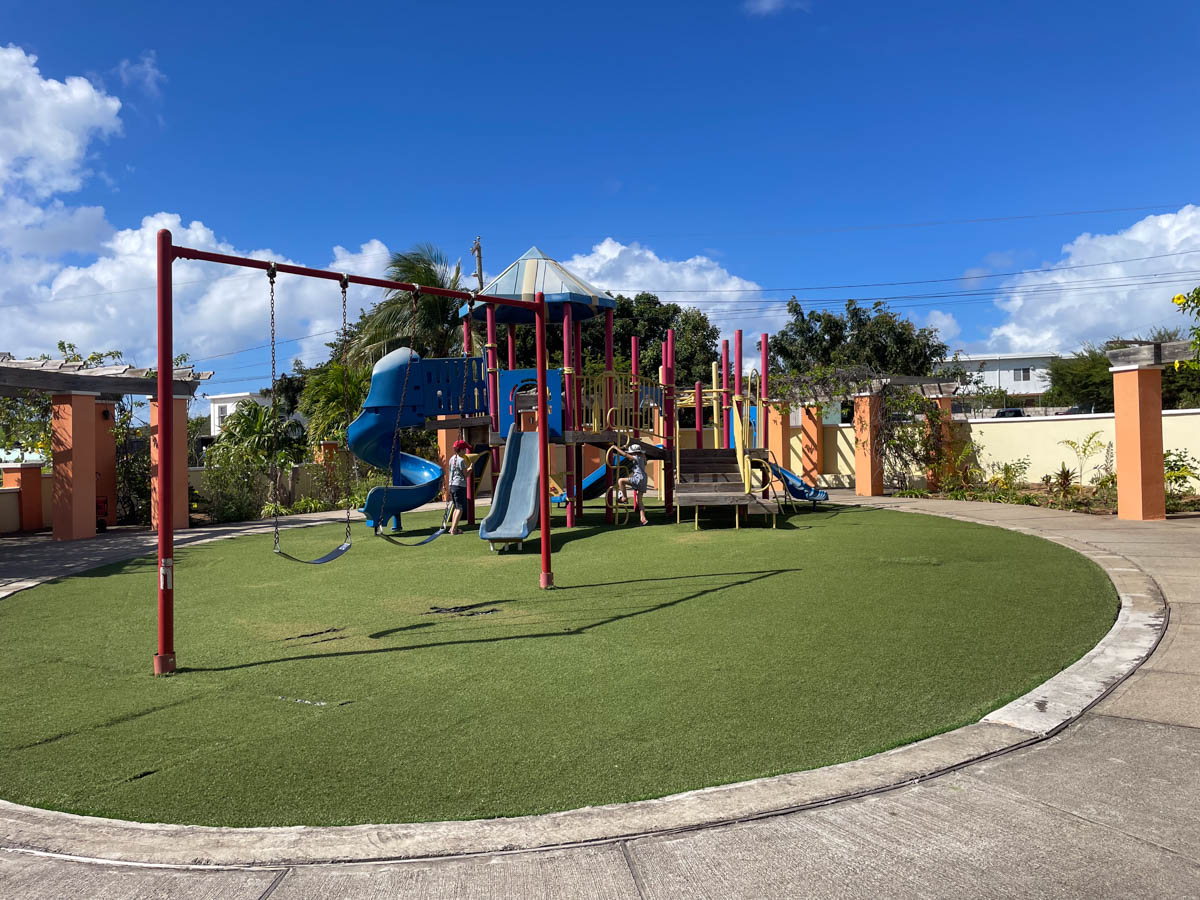 Après le déjeuner nous débarquons à la marina en annexe. Antoine part vers les douanes. Il se fait un peu gronder car il n’est pas venu dès l’ouverture ce matin (on n’a pas le droit de se reposer ici) et ils ne sont pas très coopératifs pour rendre la monnaie (comme si on avait toujours plein de petite monnaie quand on arrive pour la première fois dans un pays). Bref, nous sommes enregistrés à la douane et à l’immigration. Pendant ce temps Martin, Mathilde et Magali vont vers l’aire de jeux. Elle se trouve dans un petit parc fleuri et arboré avec une pelouse impeccable … on reconnaît la touche anglaise 😉. Martin et Mathilde joue dans la grande structure et dans les allées : ça fait du bien de se défouler les jambes. Nous nous retrouvons pour la deuxième mission qui consiste à remplir la bouteille de gaz. Nous avons repéré une station service au ponton à annexe suivant. Nous trimballons la bouteille vide (plus de 10kg) avec le chariot sur les routes chaotiques. Cependant nous arrivons trop tard(16h10). Le gars qui s’occupe du gaz sera là demain à 7h. Nous reviendrons demain…