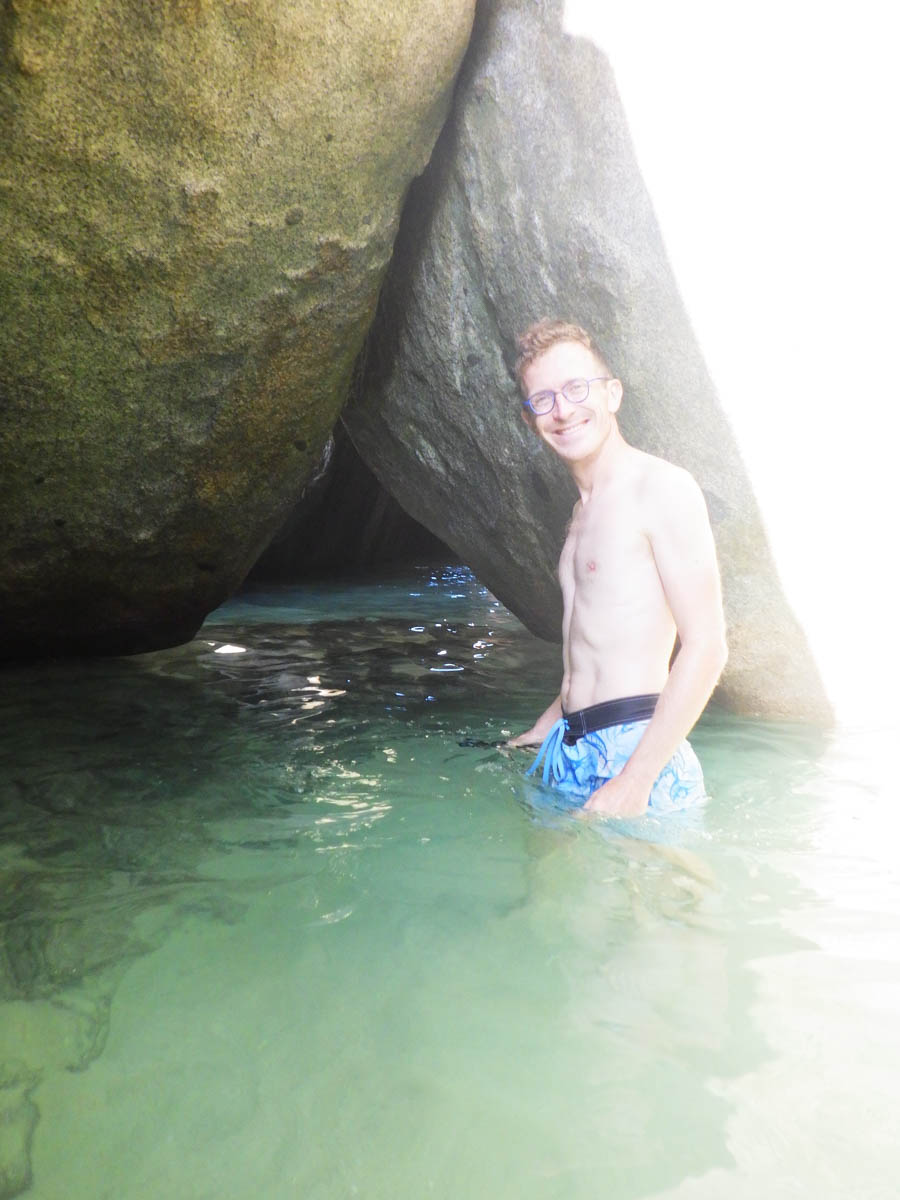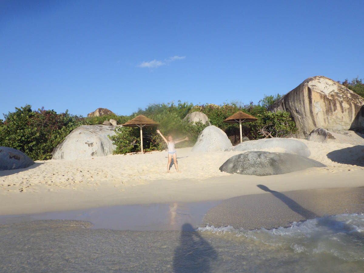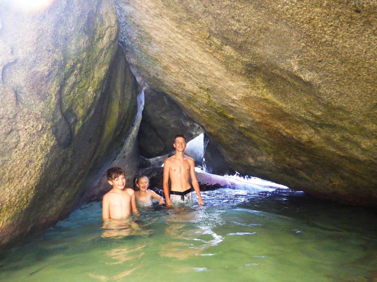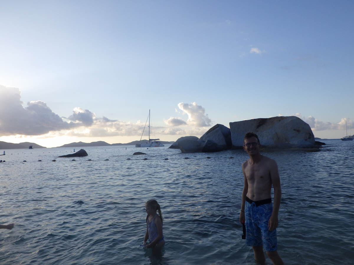 L’après-midi nous attendons que les bateaux s’en aillent des bouées devant le parc national de Devils Bay. Vers 15h nous nous déplaçons et attrapons une bouée juste devant la plage de The Baths où nous pourrons arriver. Comme ce n’est pas loin et que les annexes ne sont de toute façon pas autorisées à débarquer, nous y allons à la nage. Étant donné l’heure tardive il n’y a personne pour nous réclamer de payer l’entrée de la balade. Le soleil un peu bas fait rentrer la lumière entre les rochers. Nous nous promenons entre et sous les rochers qui sont comme posés sur le sable. Parfois nous devons marcher ou nager dans l’eau. C’est un site vraiment incroyable !