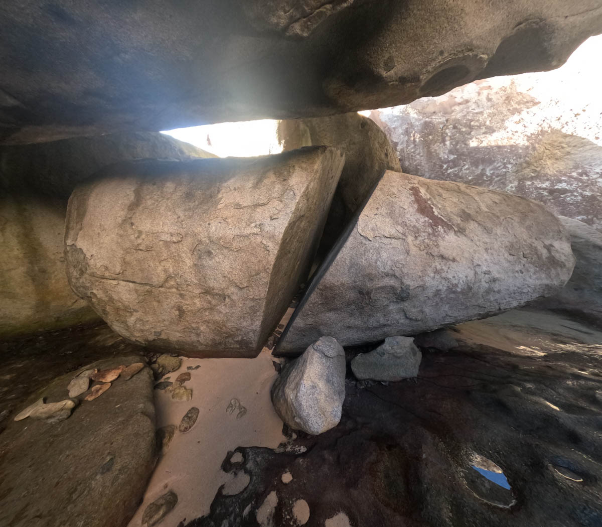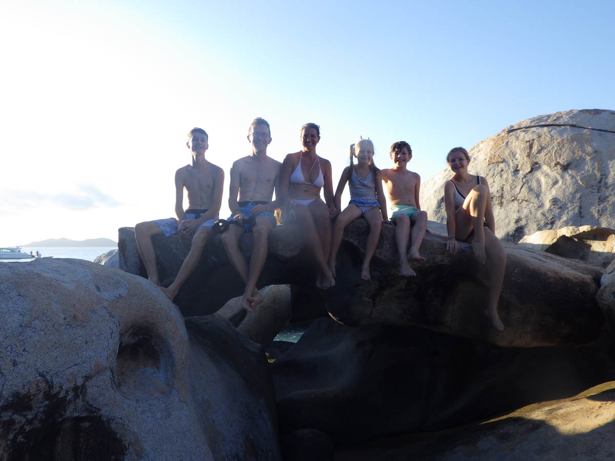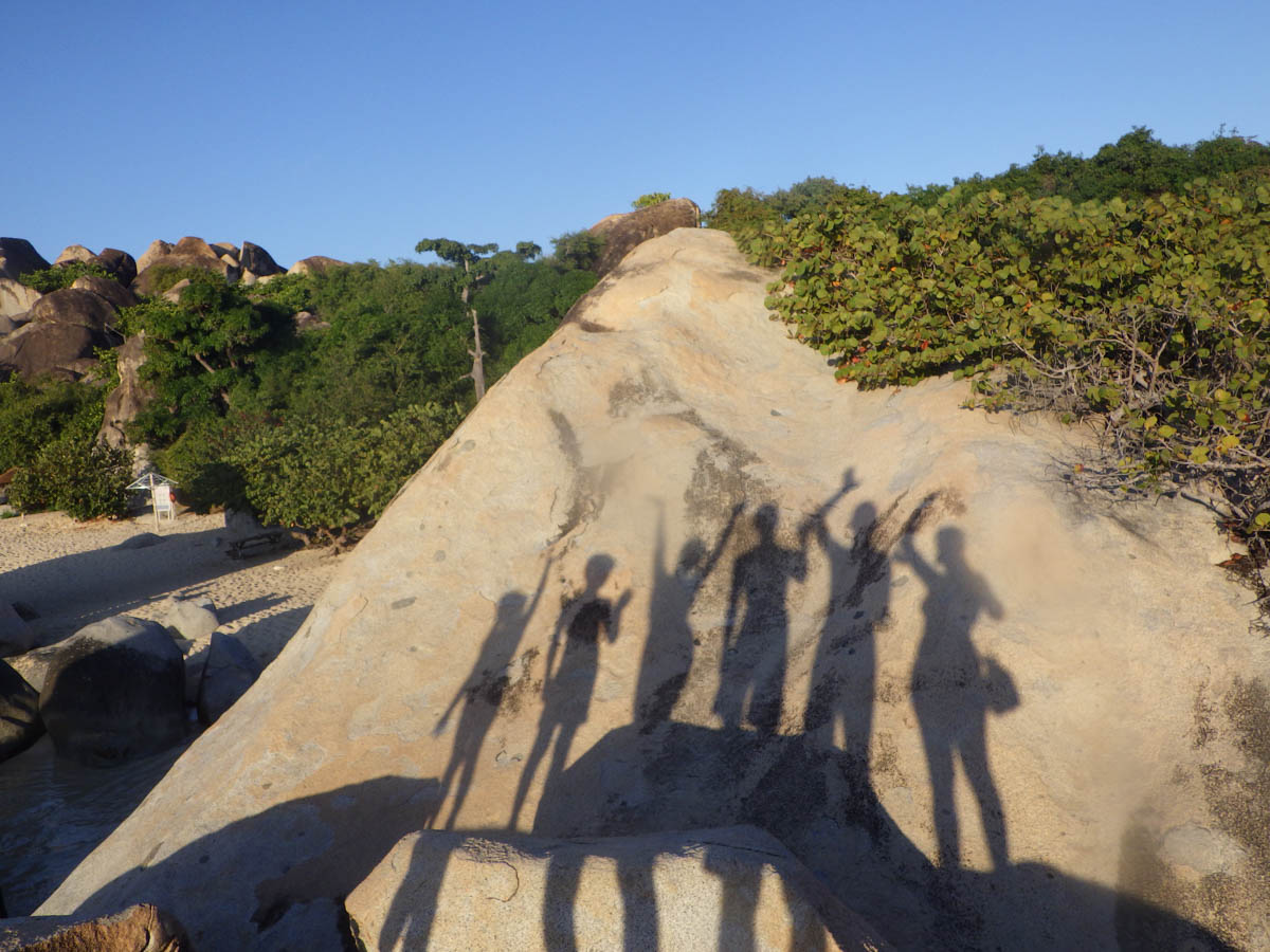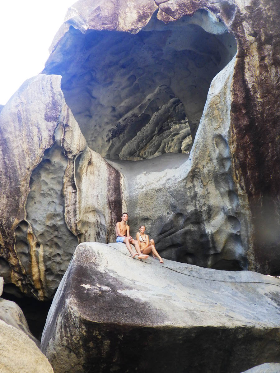 L’après-midi nous attendons que les bateaux s’en aillent des bouées devant le parc national de Devils Bay. Vers 15h nous nous déplaçons et attrapons une bouée juste devant la plage de The Baths où nous pourrons arriver. Comme ce n’est pas loin et que les annexes ne sont de toute façon pas autorisées à débarquer, nous y allons à la nage. Étant donné l’heure tardive il n’y a personne pour nous réclamer de payer l’entrée de la balade. Le soleil un peu bas fait rentrer la lumière entre les rochers. Nous nous promenons entre et sous les rochers qui sont comme posés sur le sable. Parfois nous devons marcher ou nager dans l’eau. C’est un site vraiment incroyable !