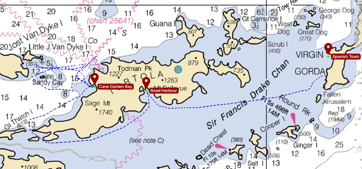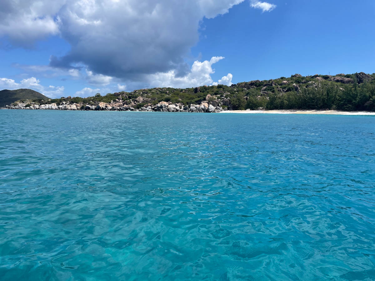 Pendant la journée, le vent oscille autour de la force et la direction qui définit la limite entre le gennaker et le solent, nous enroulons et déroulons donc en fonction mais en fait nous allons « trop » vite par rapport à notre plan qui est d’arriver au petit jour aux BVI ! Nous devons donc ralentir et finissons la journée sous solent. Le vent est tellement favorable que nous allons encore trop vite. Antoine prend un ris pendant son quart à 22h30 et malgré ça nous arrivons avant le jour à l’entrée des BVI où nous roulons le solent pour finir très lentement et attendre le lever du soleil pour mouiller devant Spanish Town, juste à côté d’un des lieux emblématiques des BVI (The Baths).