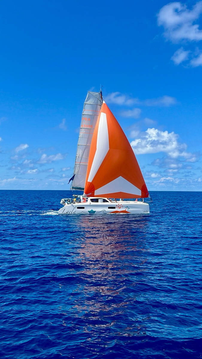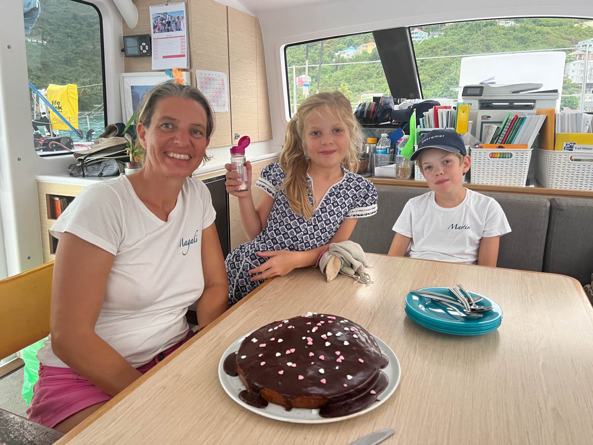 Il a plu toute la nuit, pas besoin de laver l’extérieur pour accueillir nos invités. Par contre nous passons la matinée à ranger l’intérieur. À 12h nous avons rendez-vous au Myett Hôtel pour le pot d’accueil : 5 bateaux, 15 invités et 2 personnes d’Outremer. Nous récupérons des lunch box pour déjeuner à bord. Alberto et Cynthia viennent découvrir notre bateau. Ils sont argentins italiens et habitent aux US. Alberto loue des bateaux depuis longtemps et cherche un bateau plus performant. Il n’y a pas beaucoup de vent mais nous pouvons lui montrer que justement avec un bateau comme Loela on peut tout de suite naviguer à la voile. Le soir nous nous retrouvons tous sur la plage pour un pot et un dîner « finger food ». Nous rencontrons une famille américaine avec deux enfants de 15 et 10 ans, ils sont très contents de decouvrir 2 bateaux Outremer avec des enfants à bord (Loela et Appa). Ça leur permet d’appréhender le voyage au long cours en famille. Nous aussi nous avons bien envie de discuter avec eux et de les avoir sur notre bateau demain, d’autant plus que nos ados ont déjà bien sympathisé. Antoine et Phoebe (de Appa) jouent à pierre feuille ciseaux qui les accueillera… c’est Antoine qui gagne 🤣