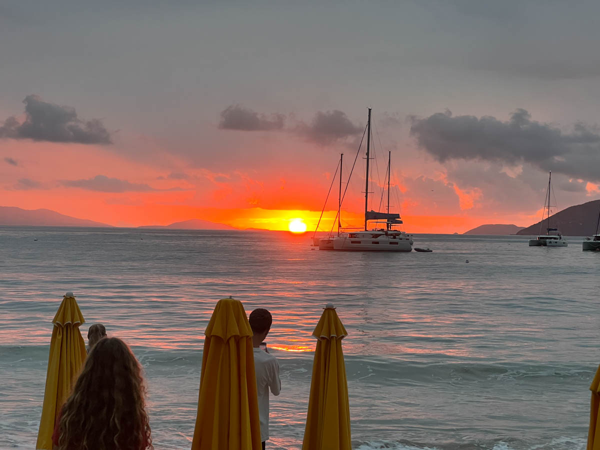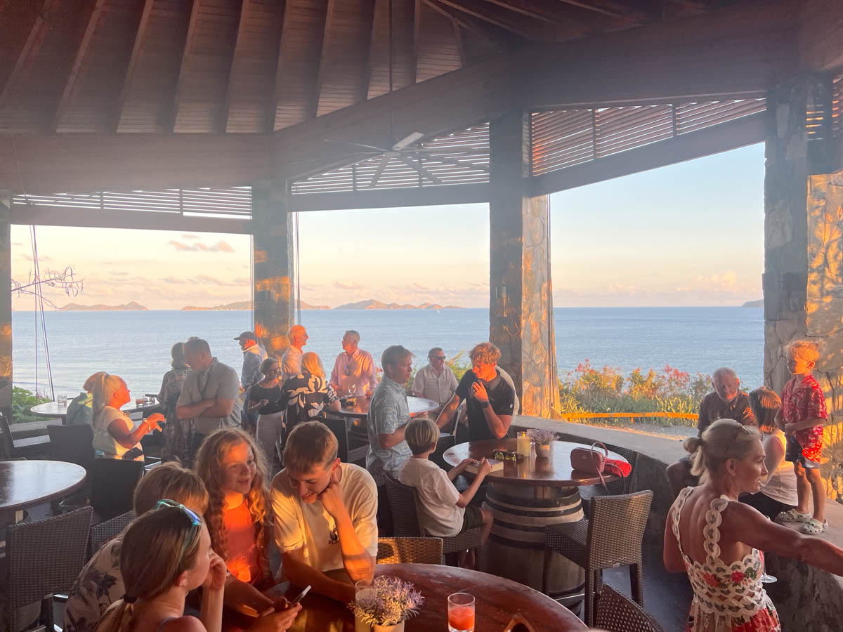 Nous avons rendez-vous à 17h à l’hôtel où des taxis collectifs nous attendent pour traverser l’île (40 min sur l’unique route cahoteuse). Ils nous déposent à un joli restaurant avec vue sur toute la baie des BVI. Nous discutons autour d’un verre au soleil couchant, puis nous dînons tous ensemble de salades variées, paella de langouste grillée et cheesecake. Le chef français est adorable, voyant que la langouste ne plait pas aux enfants, il leur prépare des pâtes.A la fin du repas il leur apporte même des coussins et couvertures pour dormir. Les ados discutent toute la soirée des différences culturelles entre la France et les USA.