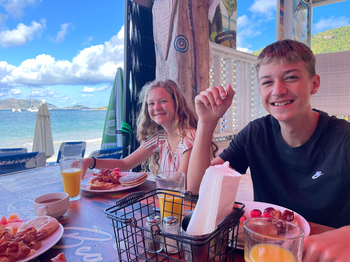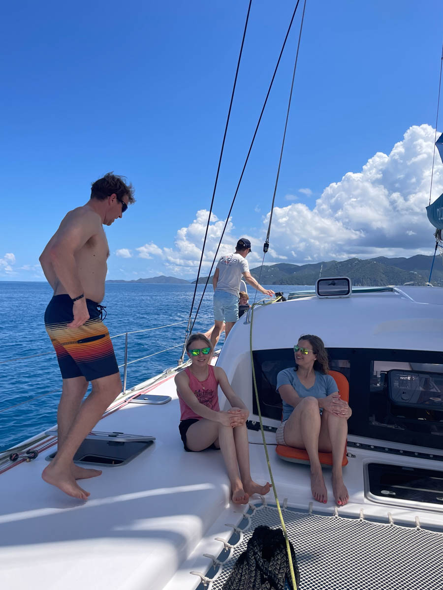 Samedi 15 mars nous nous retrouvons à 8h30 au café Paradise pour un très bon petit déjeuner américain les pieds dans le sable : toast, oeuf brouillé, bacon grillé, bagels … les enfants qui sont restés dormir au bateau ratent quelque chose ! Nous accueillons la famille Potter à bord de Loela, ils veulent partir autour du monde dans 3-4 ans quand leur grande fille sera à l’université. Leur fils de 10 ans, Lucas, est plus motivés pour accompagner ses parents en faisant l’école sur le bateau. Du côté du vent, c’est encore très calme aujourd’hui, nous hissons donc le Code zéro et installons les barres franches pour que Lucas puisse barrer comme sur son Optimist en régate. Nous faisons un tour vers l’île de Jost Van Dike où nous avons rendez-vous pour déjeuner. Mathieu nous livre les lunchbags à bord : poulet ou ribs au barbecue avec de la purée. Nous nous régalons à l’ombre de la canopée car le soleil tape fort. Avec tous les enfants nous allons faire un tour sur Sandy Spit en annexe. C’est un minuscule îlot de sable blanc avec 7 palmiers dessus : les enfants jouent dans les vagues et sur la plage et nous faisons le tour à pied en 5 minutes. L’ après-midi le vent est un tout petit peu plus fort : nous sortons toutes les voiles grâce à notre équipage de choc (gennaker, code zéro, solent). Nous avons beaucoup appréciés cette journée avec les Potter qui sont si enthousiastes, si nous avons l’occasion d’aller à Santa Barbara, nous serons heureux de les revoir.