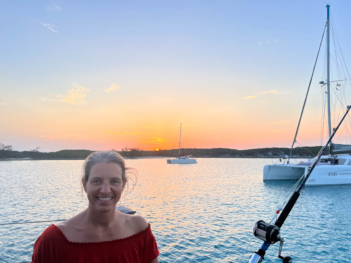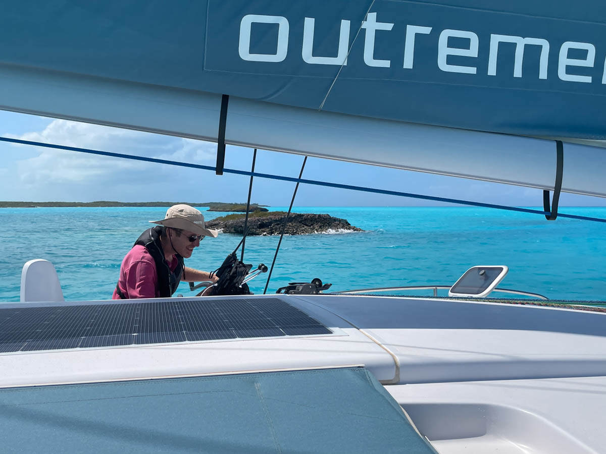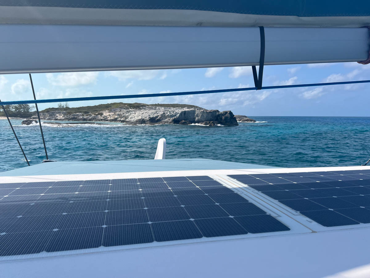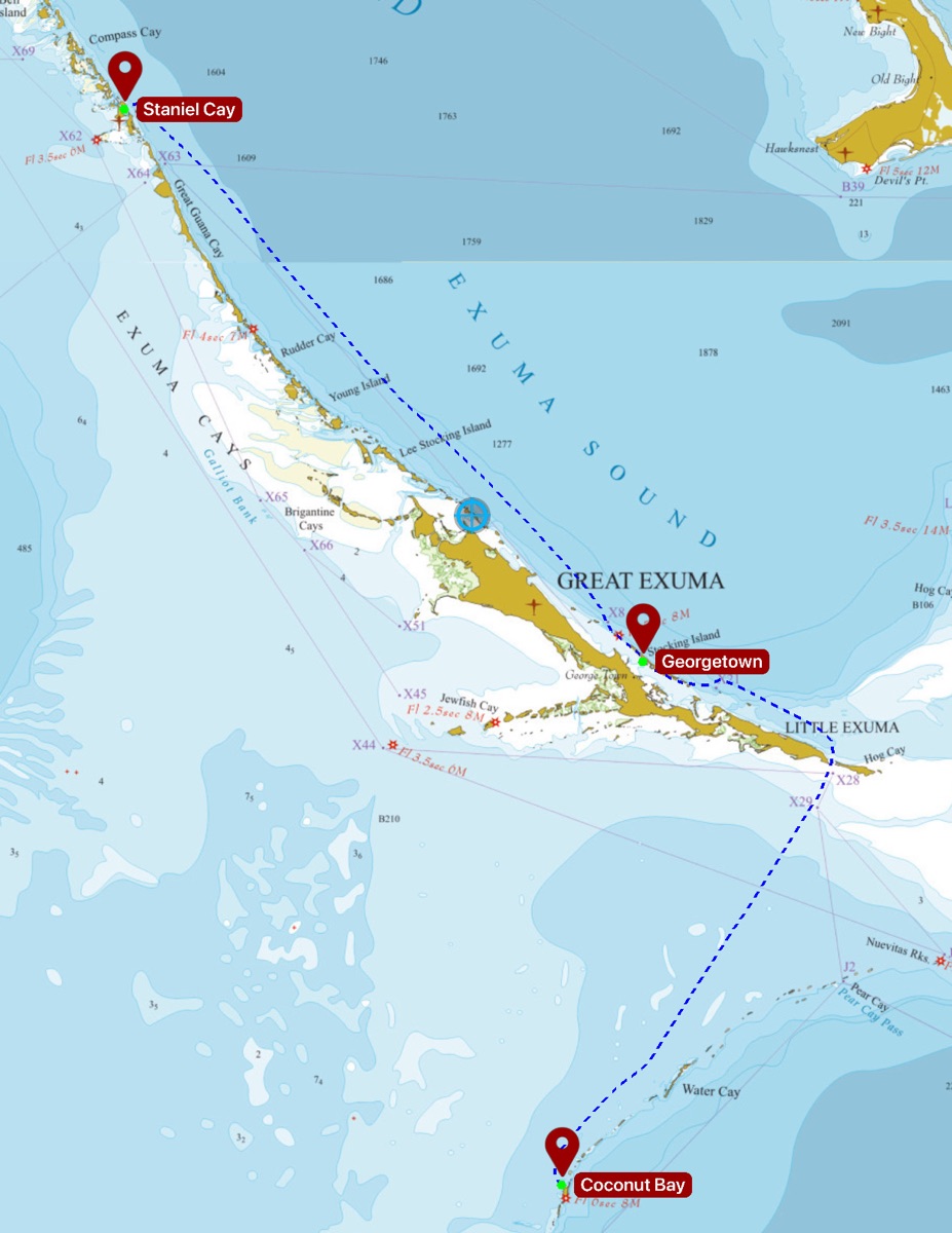 Mardi 8 avril, nous allons rallier Staniel Cay à 50 miles de GT. Comme le vent prévu est faible nous levons l’ancre au lever du soleil, départ à 7h vers l’Ouest puis le Nord-Ouest. Il y a effectivement peu de vent mais de derrière et nous avançons tranquillement. Nous passons par l’extérieur (est) des îles pour avoir une profondeur assez grande. Nous naviguons essentiellement sous Code Zéro et GV après un petit essai en mettant solent et Code Zéro « en ciseaux » (une voile de chaque côté). Apsara n’ayant toujours pas son gennaker, nous ne mettons pas le nôtre pour continuer à naviguer à vue.