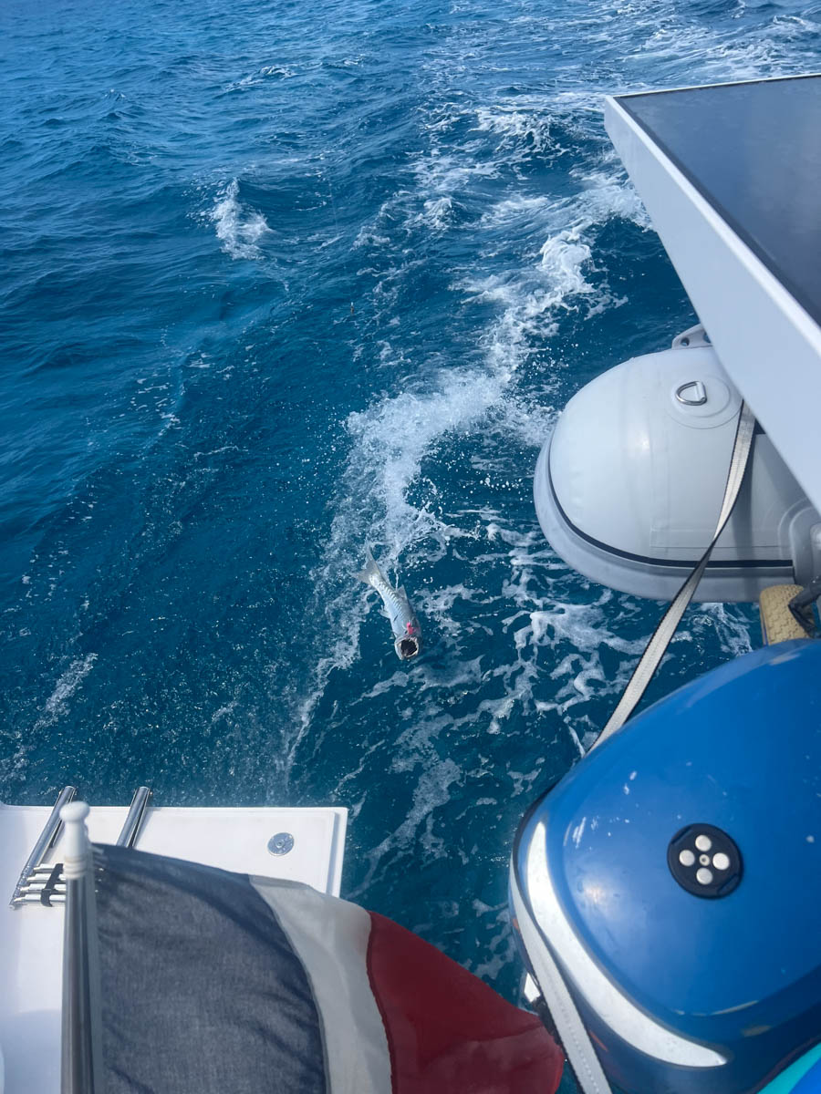 A mi-parcours, la ligne file dans son cliquetis habituel et nous devons lutter pendant plusieurs minutes pour remonter à bord notre prise du jour. Pas de chance, c’est un énorme barracuda avec ses crocs acérés et son aggressivité qui nous incitent à éviter d’approcher trop près. Pour une fois nous aurions aimé qu’il se décroche tout seul (sans emporter le leurre !) mais il est très bien accroché… Nous finissons par l’attraper avec la gaffe et sortir l’hameçon avec une pince multi-prise à longue poignées. Nous rangeons la ligne, dépités par notre prise et par les messages d’Apsara qui en a pris deux en même temps sur ses lignes à côté de nous.