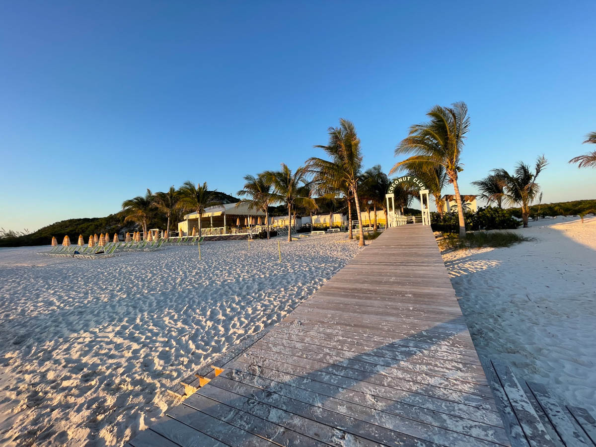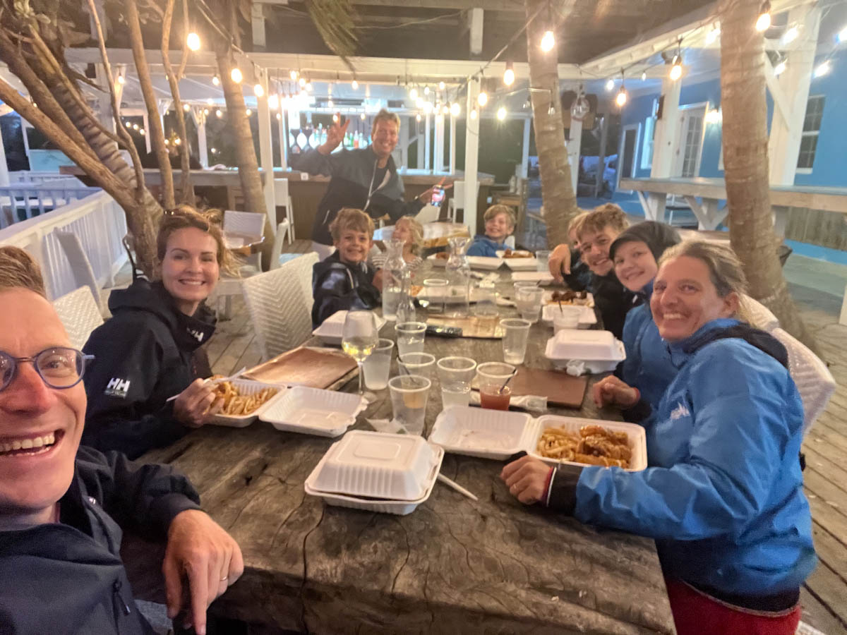 Nous y arrivons à 16h, c’est une des plus grande ville des Bahamas après Nassau. La ville est à l’ouest sur une grosse île mais il y a aussi un mouillage de nombreux bateaux sur l’îlot à l’est. Nous choisissons de jeter l’ancre au plus près de la ville pour faire les formalités, lessives et approvisionnement. Une douche rapide et nous débarquons sur le dinghy dock qui se trouve au calme sur un petit lac intérieur. Ce n’est pas vraiment une ville mais plutôt un village avec une seule route goudronnée et les autres rues en terre/sable. Nous marchons à la recherche d’un restaurant. Le village est désert, nous trouvons tout de même le Exuma Yacht Club qui ne sert que des plats à emporter ce dimanche soir mais que nous pouvons manger sur place. Ça fera l’affaire. Le temps que le dîner se prépare en cuisine, nous offrons à Apsara une photo de leur bateau que nous avons prise pendant nos navigations bord à bord, ils sont très touchés.