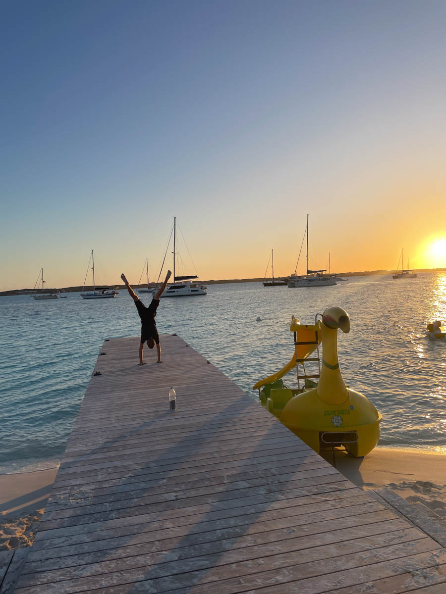 De retour au bateau, nous étendons le petit linge sur toutes les filières qui font un très bon étendoir avec ventilation intégrée. Nous n’avons fait sécher à la laverie que les draps et serviettes qui sont trop grands pour les faire sécher tous ensemble à bord… À 17h30 nous déplaçons Loela vers l’île d’en face qui est mieux protégée des vagues. Nous débarquons sur la plage au Coconut Club : le bar est fermé mais les enfants profitent des structures gonflables dans l’eau jusqu’au coucher du soleil. Arthur s’entraîne au handstand sur le ponton. Les papas discutent du programme pour demain.