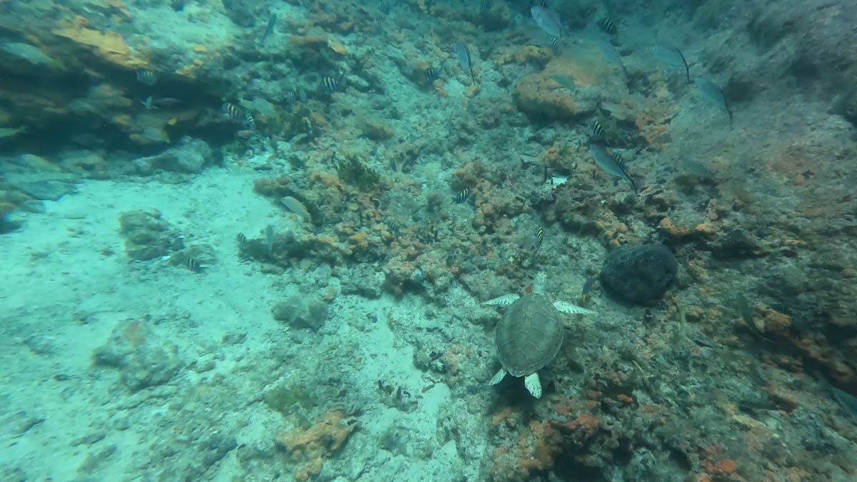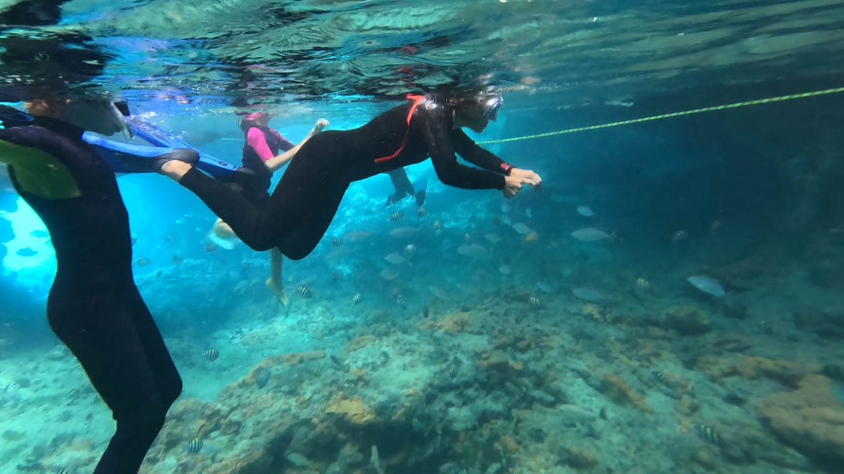 Mercredi 9 avril, nous sommes à 10h30 dans l’annexe équipés de nos combinaisons de plongée. Nous amarrons l’annexe avec son ancre devant une des entrées de la grotte. Avec masques palmes et tubas nous nageons contre le courant jusqu’aux rochers d’entrée. Un groupe d’américains anxieux barrent le passage en hésitant à pénétrer dans la grotte. Nous découvrons qu’il faut plonger sous un rocher pour atteindre l’intérieur de la grotte. Nous y arriverons tous à passer sans problème. Nous atteignons la grande salle où une multitude de poissons nagent sous nous et même une tortue traverse les fonds majestueusement. Nous explorons les différentes salles peuplées de poissons peu craintifs éclairés par les trous dans le plafond. C’est vraiment incroyable !!! A certains endroits, le plafond est quelques centimètres au dessus de l’eau. Malgré les avertissements parentaux, Mathilde essaie d’y nager et s’écorche la tête contre le plafond acéré en remontant… Aussitôt elle a le visage recouvert de sang, ce qui impressionne beaucoup tout le monde.