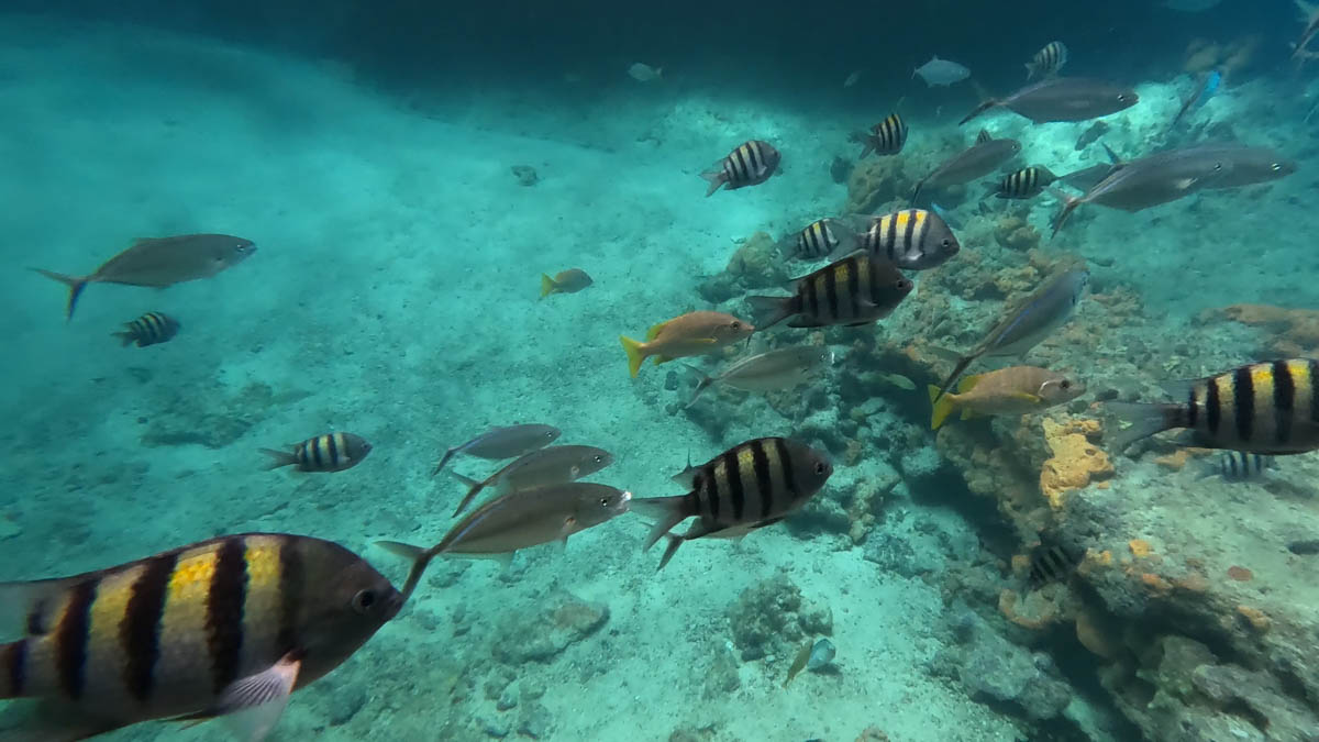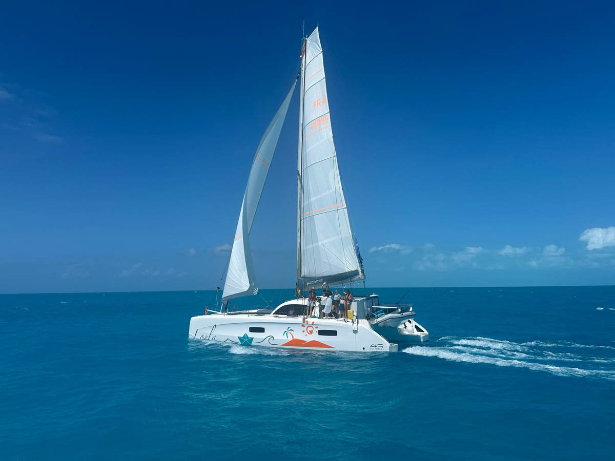 Nous finissons la traversée en surveillant les tâches noires (rochers profonds) et beige (rochers peu profonds) dans le turquoise en rattrapant le monocoque parti avant nous ainsi qu’une grappe de cata qui étaient aussi devant à l’AIS. La mer devient de plus en plus claire à mesure que nous approchons du cut et que la profondeur remonte à 3m puis 2m. Nous sommes un peu en avance et sur la marée et sur Apsara donc nous ralentissons en roulons le solent pour laisser un peu de temps passer. En attendant, nous nous gavons de turquoise dans toutes ses nuances.