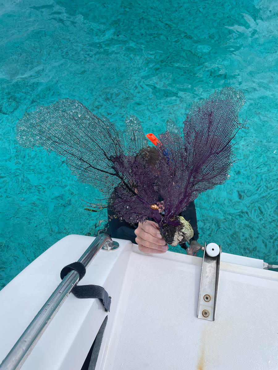 Nous ressortons par une autre entrée qui ne nécessite même pas de passer la tête sous l’eau puis nous retournons au bateau rapidement pour la soigner. Heureusement ce n’est que superficiel, quelques tous petits trous d’un mm de diamètre. Elle sera vite rétablie. Avant de remonter à bord, Antoine trouve sous le bateau un corail qui a sans doute été arraché par un autre bateau et laissé là. Il le remonte pour l’admirer avant de le remettre au fond. Nous essayons d’éviter de prélever les merveilles naturelles que nous admirons !