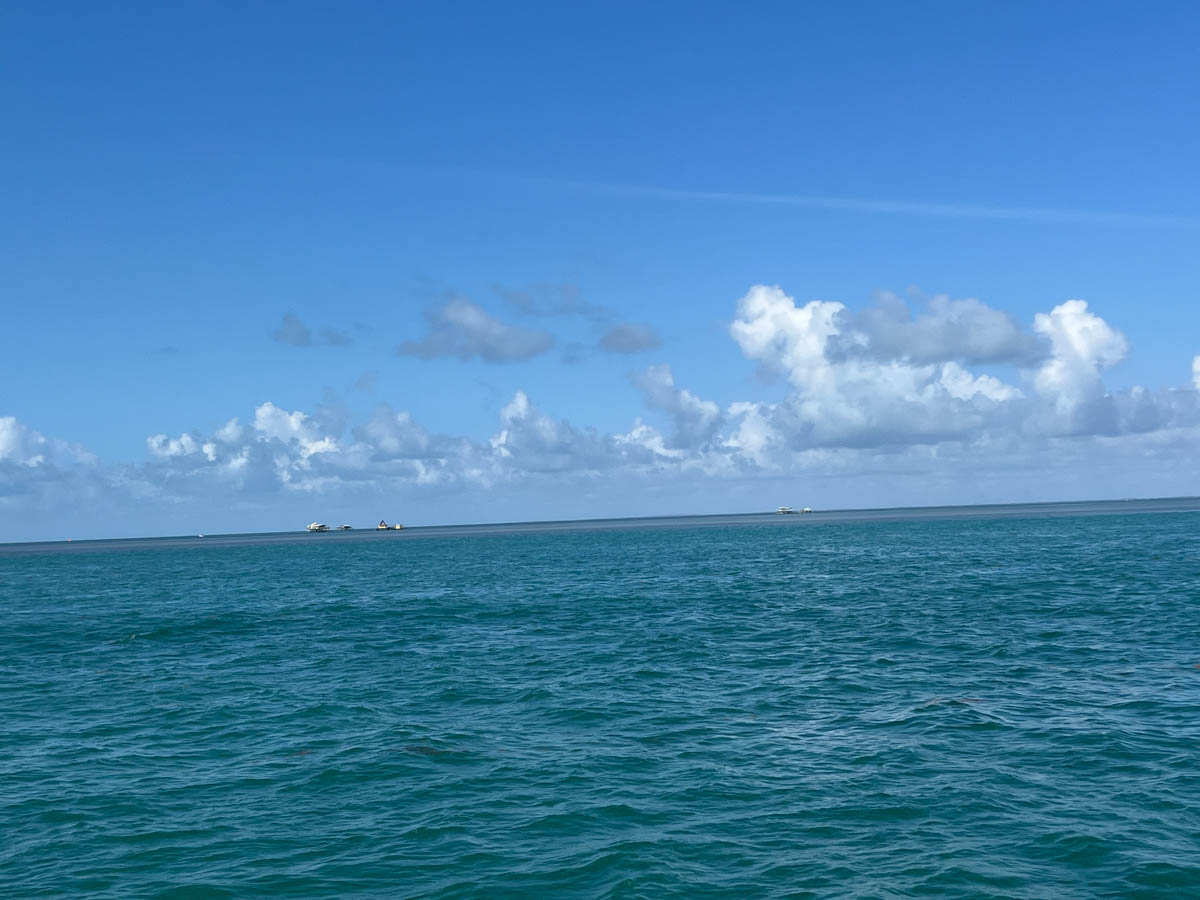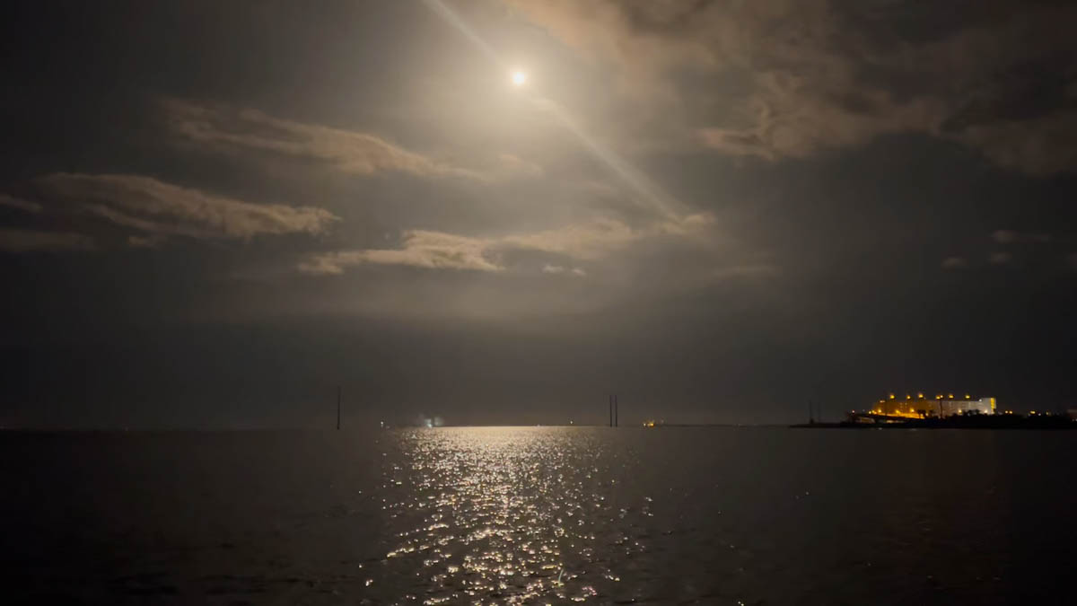 La nuit se couche et nous nous guettons l’heure de 21h28. Une fusée de SpaceX va décoller de Cape Canaveral juste devant nous pour mettre une énorme grappe de satellites en orbite. Nous sommes tous en gilet de sauvetage et attachés aux lignes de vie de Loela. Dans la nuit noire nous voyons à l’heure exacte un feu rouge sur la terre, la fusée s’élève dans le ciel. Quelques minutes après le premier étage se détache et la fusée continue son chemin dans l’atmosphère, nous suivons le point rouge pendant 5 minutes. Nous entendons alors (plusieurs minutes après) très distinctement le bruit du décollage, nous vivons en direct la différence de vitesse entre la lumière et le son. Le bruit qui ressemble à celui d’un tremblement de terre doit être encore plus impressionnant près du lancement.
