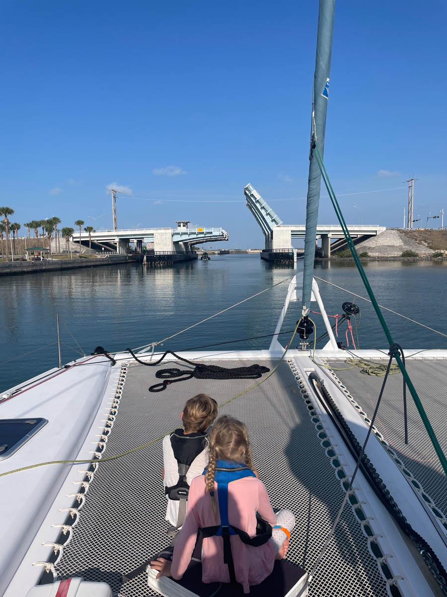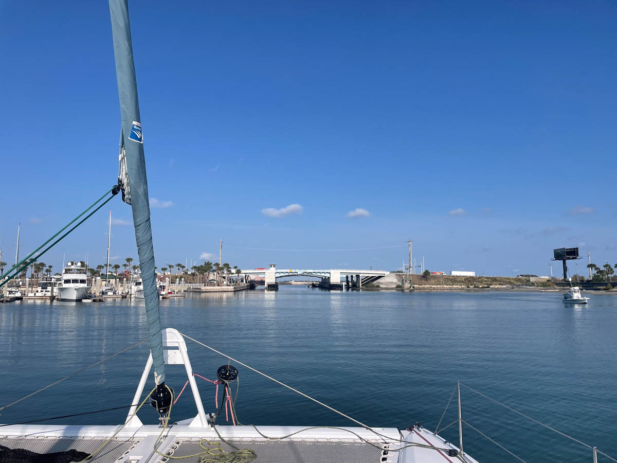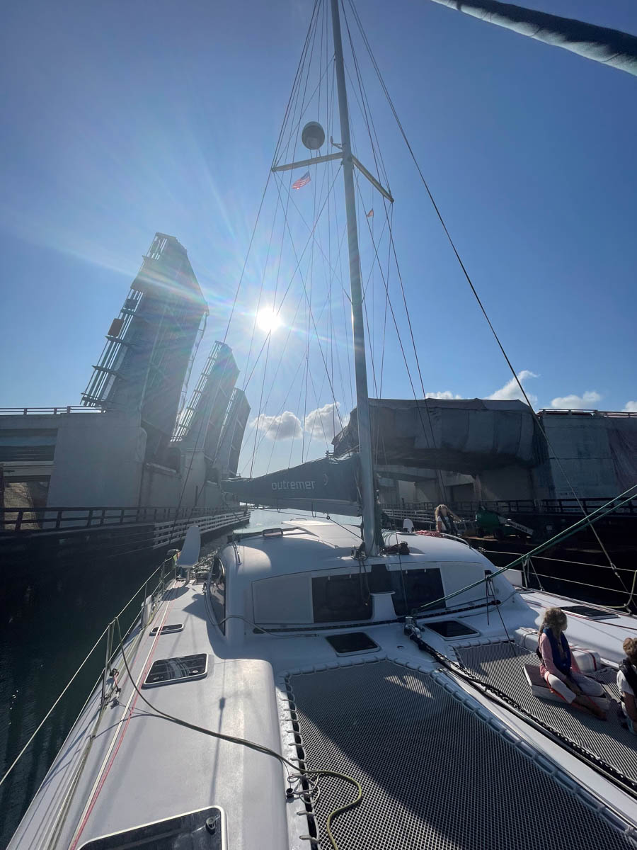 Antoine appelle le canal VHF 9 pour nous faire ouvrir le pont. Il est en travaux alors seulement la moitié s’ouvre. Heureusement que nous ne sommes pas si large et le mât passe sans encombre entre les deux parties du tablier.