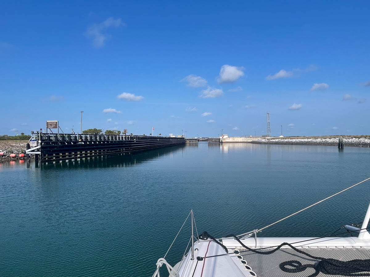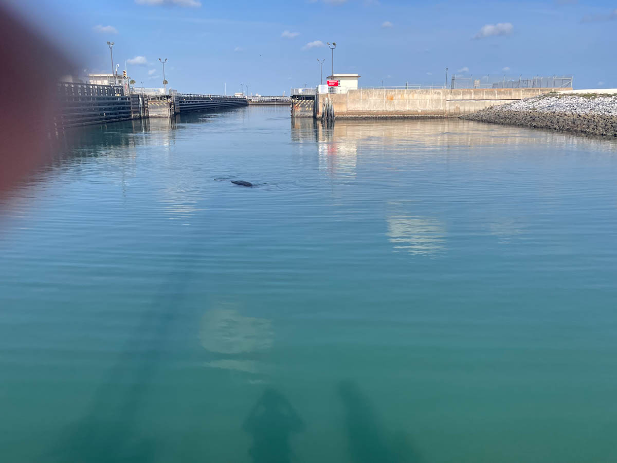 Pendant que la première porte se referme puis la deuxième s’ouvre, nous admirons le ballet des lamantins et d’un troupeau de raies carrées. Sur les côtés des cormorans et des pélicans sont aux aguets d’un poisson appétissant. L’eau est claire et nous voyons de gros poissons évoluer sans craindre les pêcheurs qui sont interdits dans l’écluse. L’éclusier vient discuter avec nous jusqu’à la sortie. Nous pouvons à présent naviguer dans l’ICW dont l’eau est beaucoup plus noire. Nous ne pourrons pas faire de l’eau ici, heureusement que nous avons rempli le réservoir en mer.