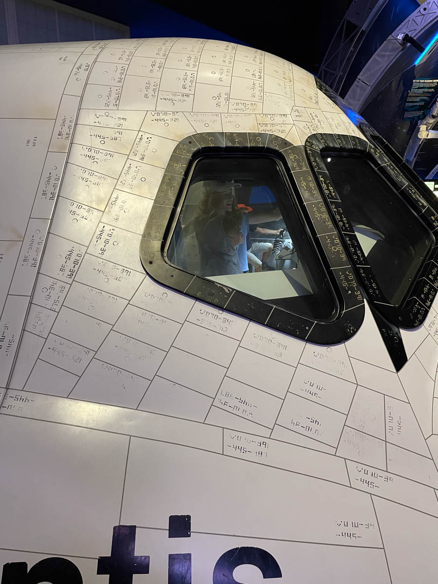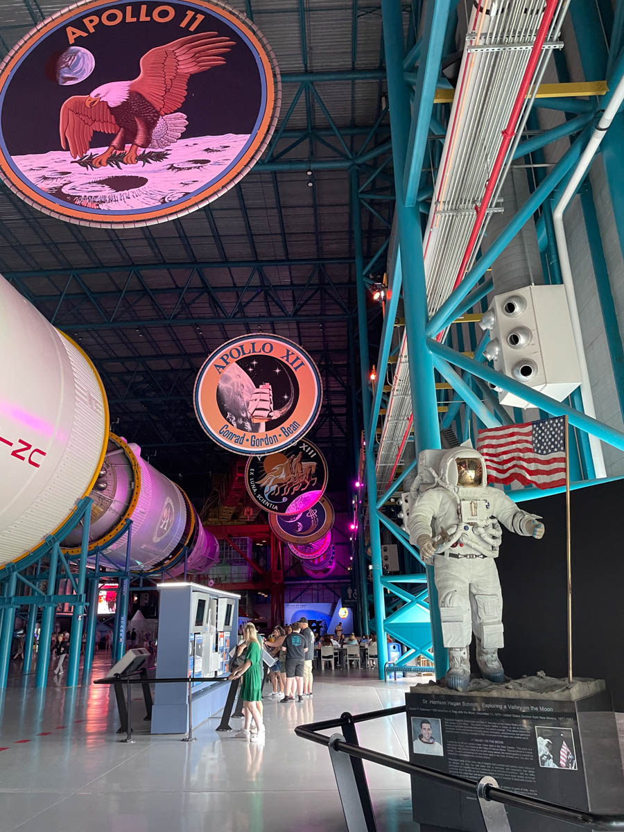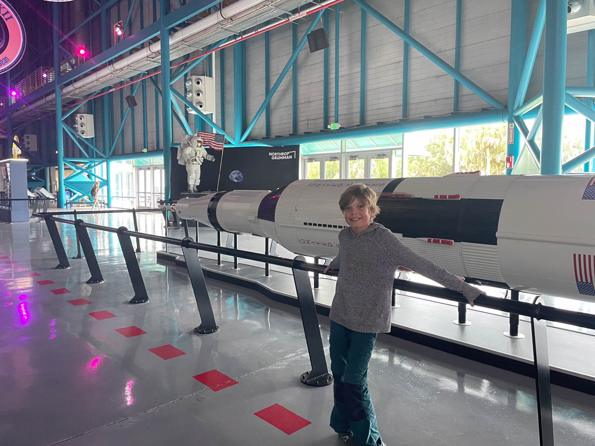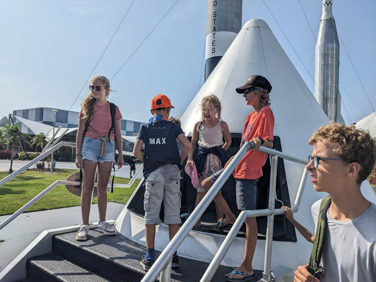Nous commençons par une visite guidée du jardin des fusées. Une dizaine de fusées grandeur nature sont présentées depuis les toutes premières fabriquées à partir de missiles balistiques lorsque les américains découvrent que les russes ont pris de l’avance sur eux dans la course à l’espace et sont capables d’envoyer un satellite jusqu’au dessus des USA. Les enfants jouent dans les capsules spatiales et nous découvrons que le tout premier vol d’un américain « dans l’espace » n’a consisté en fait que d’un vol de Cape Canaveral jusqu’au Bahamas en passant à 187km d’altitude, un peu comme les vols commerciaux actuels « dans l’espace ». Cependant, les choses sont rapidement devenues plus sérieuses et malgré de nombreux échecs, les américains ont recruté des astronautes et amélioré leurs fusées pour envoyer d’abord des capsules en orbite puis un être humain. Il faut dire que le président Kennedy leur avait mis une sacré pression en fixant l’objectif de déposer un homme sur la Lune et de le ramener alors qu’ils n’avaient même pas encore mis un humain en orbite !