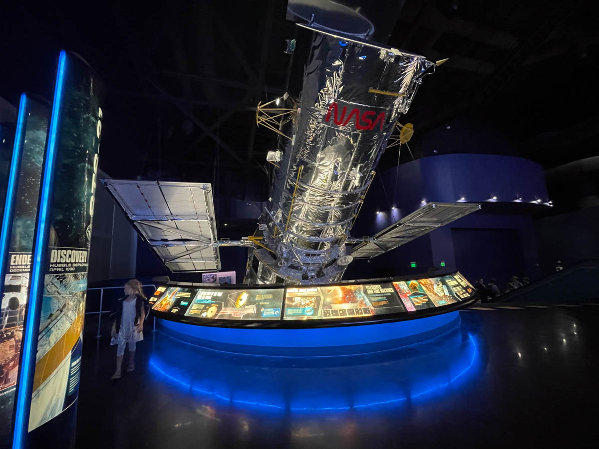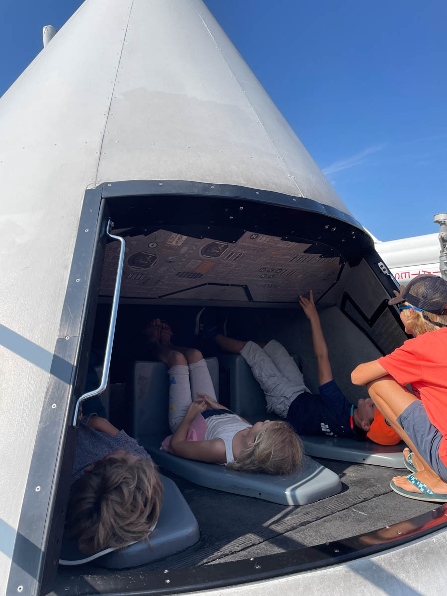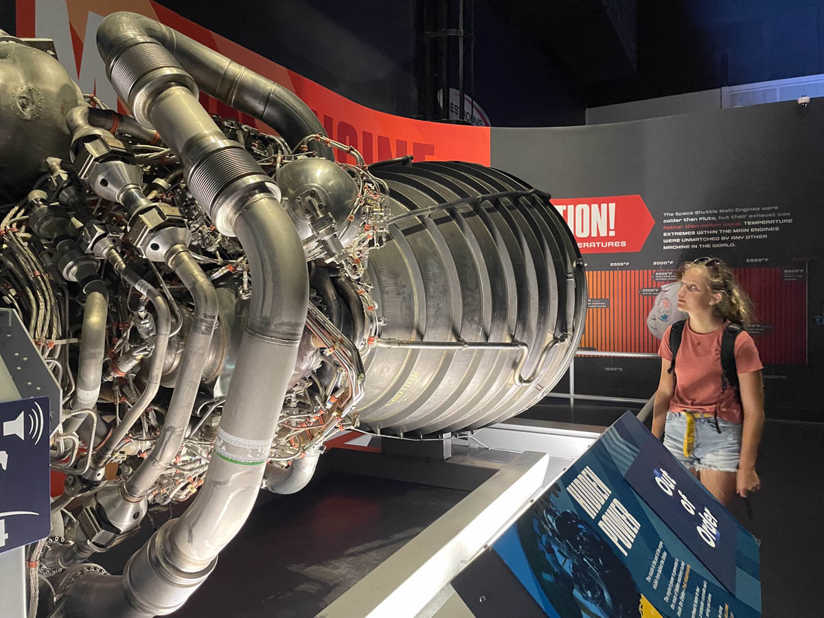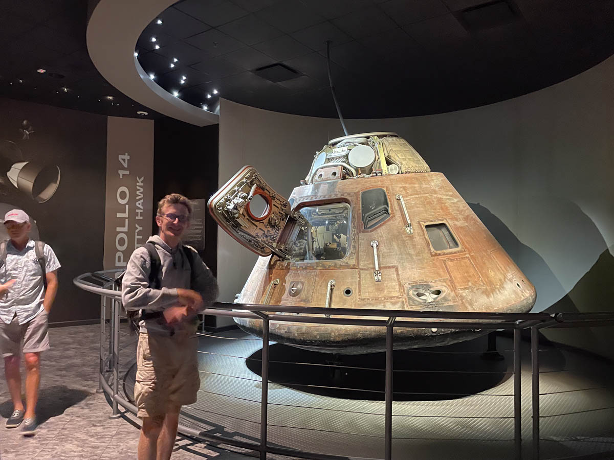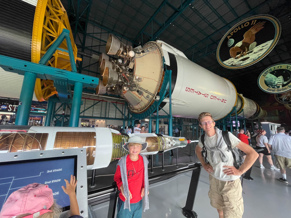 Nous commençons par une visite guidée du jardin des fusées. Une dizaine de fusées grandeur nature sont présentées depuis les toutes premières fabriquées à partir de missiles balistiques lorsque les américains découvrent que les russes ont pris de l’avance sur eux dans la course à l’espace et sont capables d’envoyer un satellite jusqu’au dessus des USA. Les enfants jouent dans les capsules spatiales et nous découvrons que le tout premier vol d’un américain « dans l’espace » n’a consisté en fait que d’un vol de Cape Canaveral jusqu’au Bahamas en passant à 187km d’altitude, un peu comme les vols commerciaux actuels « dans l’espace ». Cependant, les choses sont rapidement devenues plus sérieuses et malgré de nombreux échecs, les américains ont recruté des astronautes et amélioré leurs fusées pour envoyer d’abord des capsules en orbite puis un être humain. Il faut dire que le président Kennedy leur avait mis une sacré pression en fixant l’objectif de déposer un homme sur la Lune et de le ramener alors qu’ils n’avaient même pas encore mis un humain en orbite !
