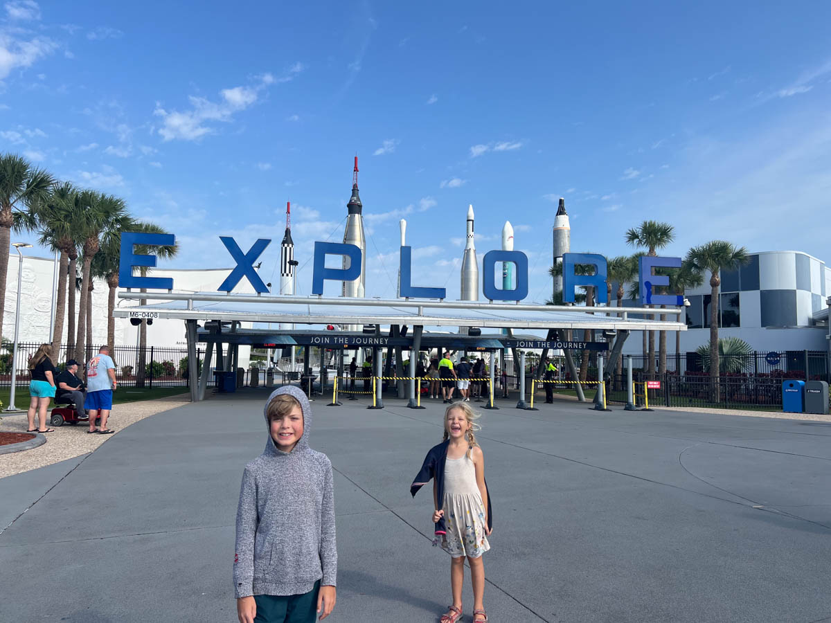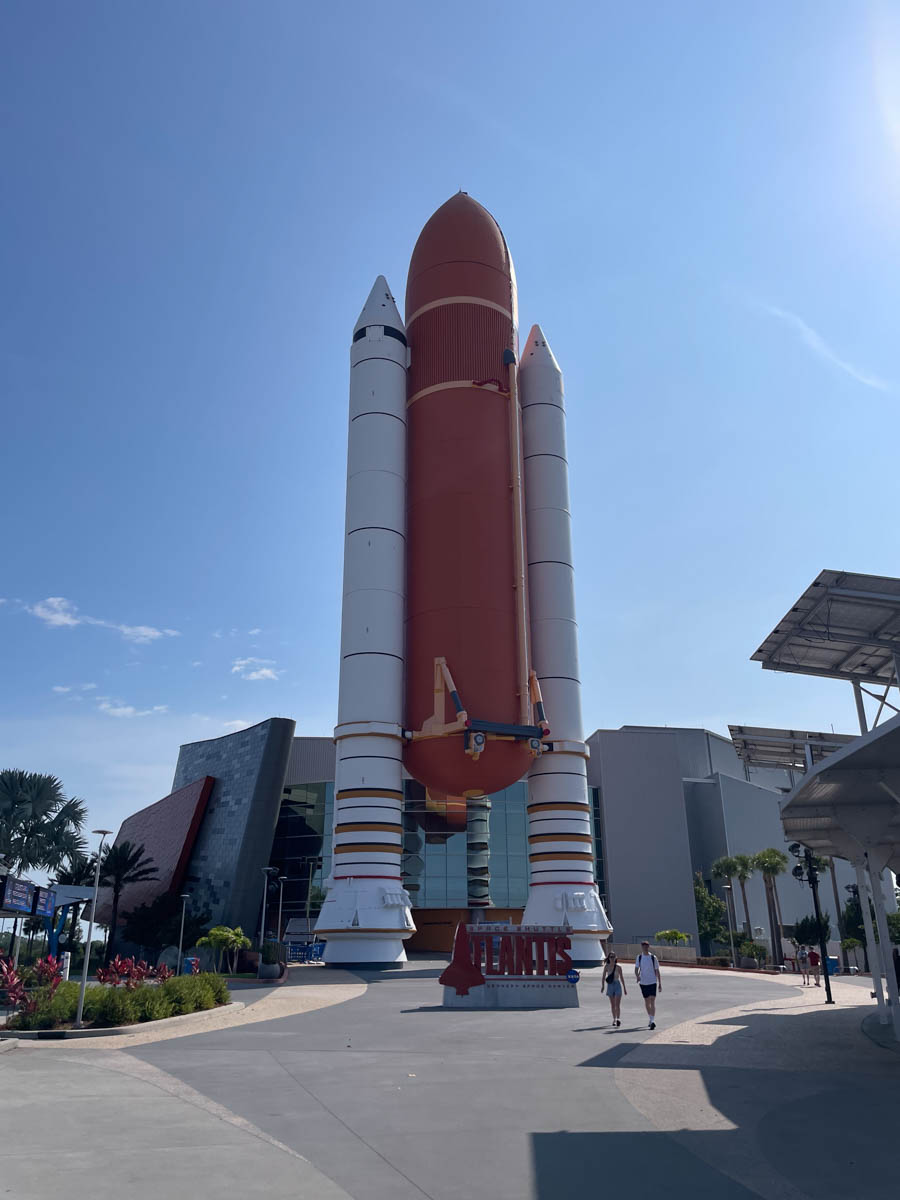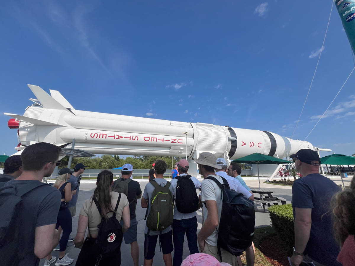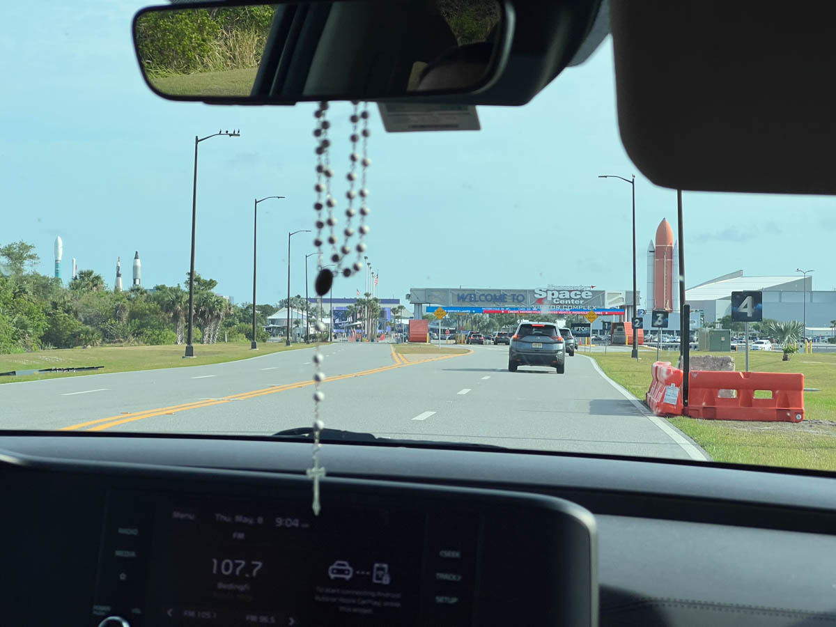 Jeudi 8 mai nous partons à 8h du bateau en annexe, nous traversons le canal et passons sous un pont pour rejoindre un ponton dans une petite marina très pratique où nous pouvons laisser les annexes amarrées en sécurité pour la journée, surveillées par la faune locale. Nous commandons un Uber près de l’aire de jeux. En 15 min de larges routes toutes droites nous entrons dans le Kennedy Space Center.