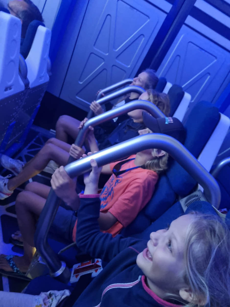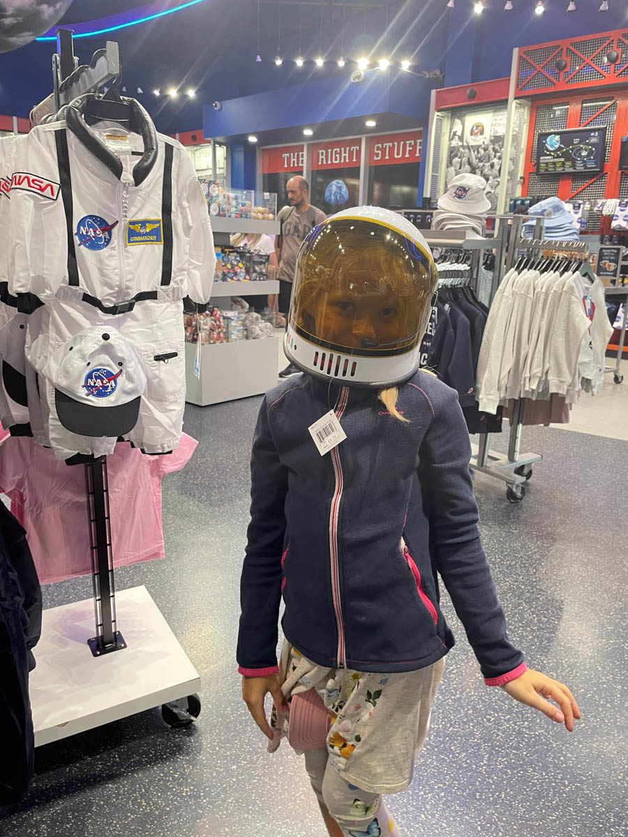 Dans l’exposition, nous apprenons de nombreux détails sur les vols en navettes spatiales. La reconstitution du cockpit d’une navette amuse beaucoup les enfants qui se mettent dans la peau des astronautes pour tenter de la poser sur la piste ou de piloter le bras robotisé. Nous descendons à l’étage inférieur en toboggan et découvrons la vie dans la station spatiale internationale. Le clou de la visite est le simulateur de décollage d’une navette spatiale. Nous sommes tous propulsés dans l’espace. En plus d’être très impressionnant, c’est une attraction très didactique car toutes les secousses sont expliquées : l’allumage du moteur de la navette, la poussée des boosters et sont arrêt, la reprise avec le moteur de la navette, le tout en suivant la trajectoire sur un écran. Tout le monde est enchanté de l’expérience !