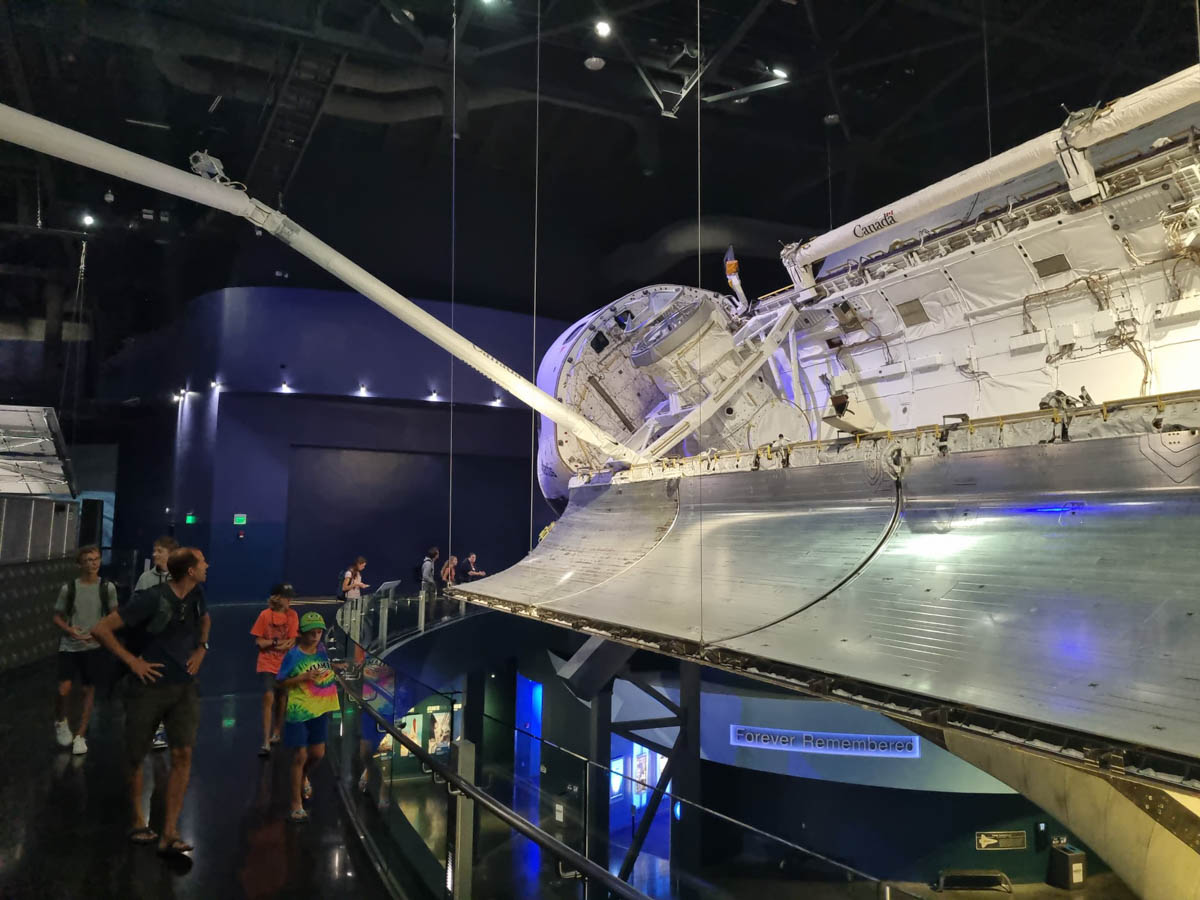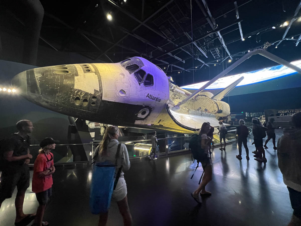 Nous nous dirigeons ensuite vers le hall Atlantis consacré aux navettes spatiales. Un film introductif très immersif raconte comment les ingénieurs de la NASA ont conçu un véhicule spatial réutilisable pour amener des objets et des hommes dans l’espace et en revenir. Avant cela les fusées perdaient la plupart de leur matériel dans l’espace, seul la capsule revenait. Ils ont eu l’idée de construire un engin entre l’avion et la fusée propulsé par deux boosters et alimenté par un énorme réservoir de carburant détachable. Pour revenir sur terre il utilise principalement l’attraction terrestre. A la fin du film, l’écran de projection devient semi-transparent puis s’ouvre sur une immense salle présentant la vrai navette Atlantis, une des 6 navettes construites. Les américains ont vraiment le sens de l’entertainement !