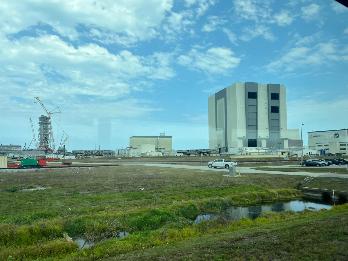 Rassasiés de hamburgers et de glaces, nous montons dans le Bus Tour. Nous traversons la base spatiale en passant devant l’immense (la partie étoilée du drapeau américain peint dessus est de la taille d’un terrain de basket !) hangar d’assemblage des fusées (VAB : Vehicule Assembly Building) et le pas de tir de lancement des fusées. Actuellement la NASA ne lance plus de fusées car ils se concentrent sur le programme Artemis pour reprendre l’exploration de la Lune puis de Mars. Ils ont privatisé les lancements de satellites et les installations sont utilisées par Space X et Boeing.