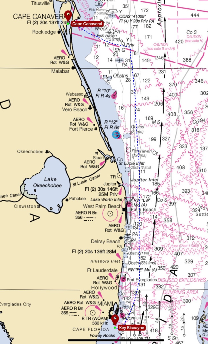 Mardi 6 mai nous nous sommes mis d’accord avec Solaine pour partir à 9h vers Cape Canaveral. Matlo attend la livraison de son chauffe-eau réparé pour nous rejoindre dans quelques heures. Nos copains américains de Lady Grey ont décidé de nous rejoindre aussi de Fort Lauderdale où ils ont finis leurs réparations avant la livraison de leur bateau, déjà vendu, nous sommes bien contents de les revoir demain. Nous avons 180 miles à parcourir donc nous devrions arriver dans 24h.