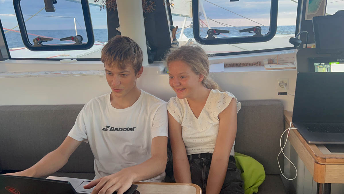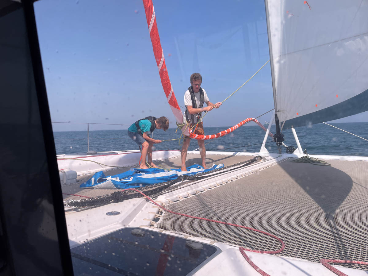 Dès la fin du déjeuner, le vent tombe puis tourne complètement et remonte du SE ! Nous roulons le gennaker et nous retrouvons au bon-plein sous solent et GV pleine avec 12 à 15nds de vent en 5 minutes. L’allure s’accélère et nous filons 8nds jusqu’au dîner où le vent faiblit et tourne encore à droite avant de remonter pour le quart des ados. Nous suivons un cap ENE au largue serré avec 17-18 nds ce qui est très rapide, nous sommes maintenant à 10nds tranquillement. Pendant le quart des ados, Antoine a quand même un peu de mal à dormir car l’allure n’est pas encore très stabilisée même si les mouvements du bateau sont très doux car la mer est plutôt peu formée.