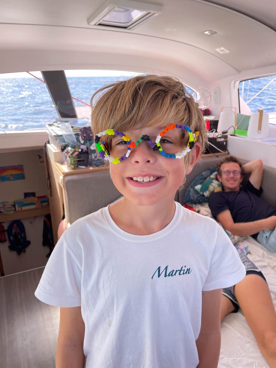 Le courant qui accélère, jusqu’à 5nds, fait un peu baisser le vent ressenti et nous renvoyons le ris avant que Magali n’aille se coucher puis Antoine déroule le gennaker. Le vent s’oriente de plus en plus derrière nous, nous essayons un bon moment le gennaker amuré au vent et finalement, Magali propose d’affaler la GV après le déjeuner car elle bat étant donné que nous avons de la mer de travers et peu de vent de derrière. Nous nous mettons donc dans la configuration gennaker seul car c’est une bonne solution pour faire une route très abattue. C’est confortable et les enfants peuvent jouer sans ressentir de mal de mer (belle lunettes en ++ de Martin). Un beau coucher de soleil nous accompagne vers la nuit.
