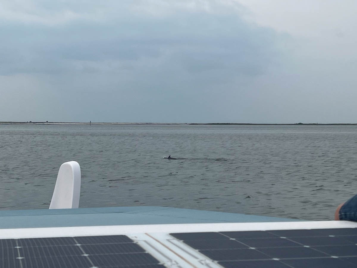 Nous ne sommes donc pas très pressés ce samedi 13 mai matin pour lever l’ancre car si nous partons trop tôt nous risquons de rencontrer les fronts qui pourraient passer sur notre trajectoire. Nous prenons le temps de dire au revoir à tous les copains avant de passer par l’ouverture du pont de 11h30. Le courant est avec nous et les nuées d’oiseaux aussi dans la sortie de l’inlet ! Il doit y avoir un phénomène de marée qui rassemble les poissons car les oiseaux sont partout. Nous passons devant la plage qui cette fois est peuplée de 4X4 pour les pique-niques du week-end. Des vagues se forment dans le goulet de sortie, nous valsons un petit peu mais cette fois la vaisselle est calée.