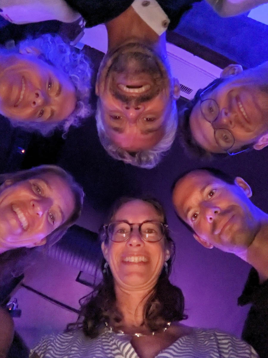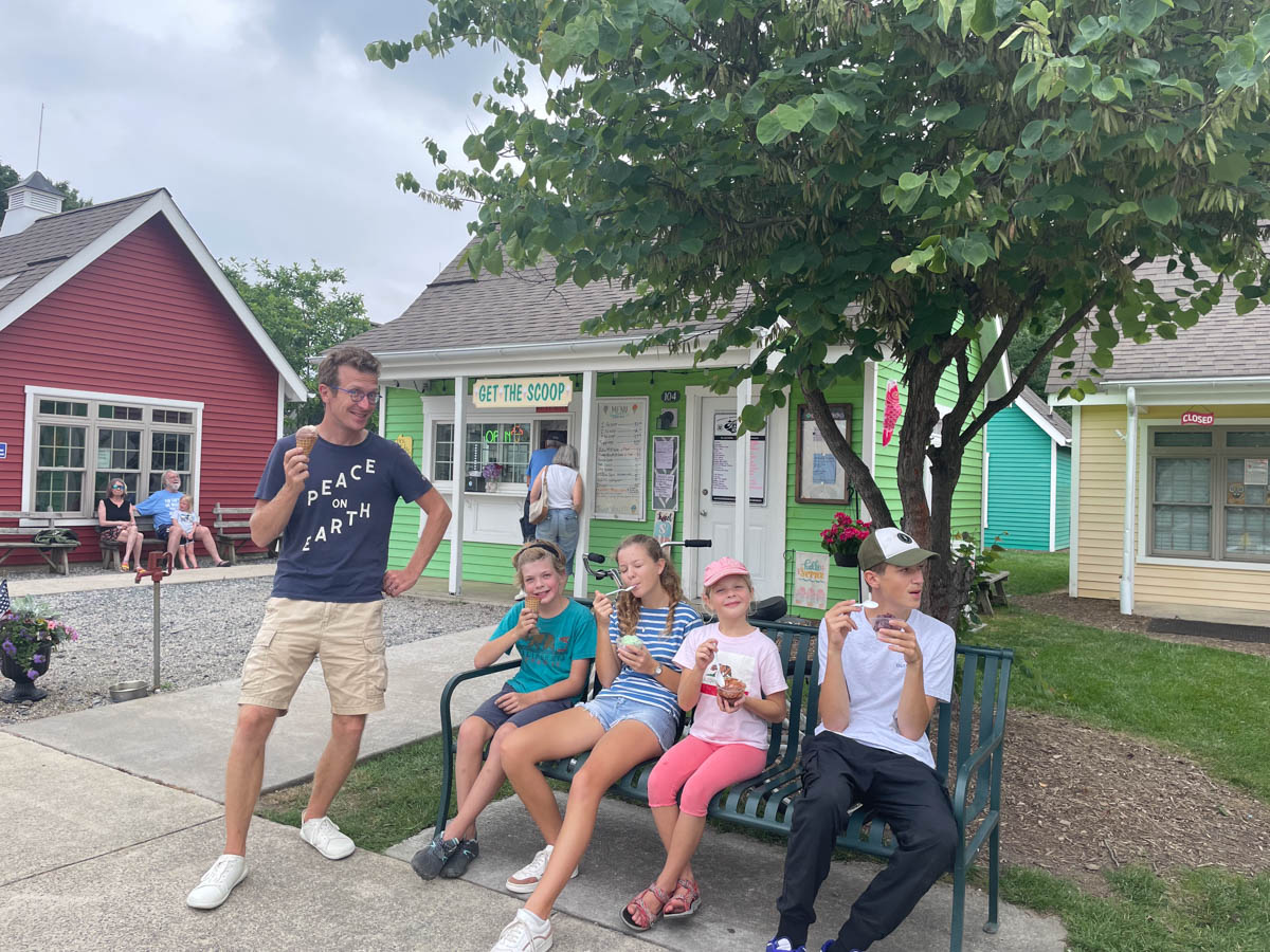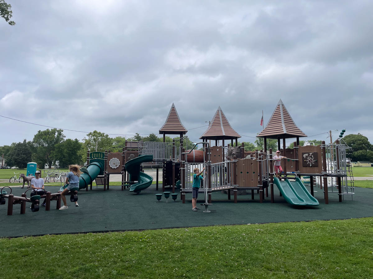 Mardi 17 juin réveil tranquille, Antoine part faire un footing à terre avec douche chaude à la marina au retour. Martin, Mathilde et Magali font une partie de Bonne Paie : objectif : atteindre 10 000 F pour arrêter. Martin y arrive en premier au bout de 7 tours de plateau. Il y a toujours un voile nuageux mais pas de pluie et les températures sont plus douces, nous ressortons donc les shorts et T-shirt pour aller explorer la petite ville de Rock Hall en vélo. À la marina il n’y a pas de vélo enfant alors Mathilde s’installe sur le guidon d’Antoine. C’est très tranquille en semaine, il n’y a que 2 restaurants ouverts sur la dizaine installés. Le week-end ça doit être plus actif car tous les établissements et boutiques touristiques ne sont ouverts que vendredi samedi et dimanche. Nous avons repéré un restaurant de crabe sur la marina donnant sur la baie. Nous dégustons alors des Crabe Cakes locaux (peut-être car nous avons croisé sur l’eau des multitudes de casier). Nous continuons notre chemin le long des rues de petites maisons en bois basses et ornées de jardins fleuris magnifiques. Nous arrivons à l’aire de jeux communautaire : elle est énorme ! Nous pensons qu’ils ont pris toutes les options possibles du catalogue. Les enfants s’amusent comme des fous surtout quand Mathias et Loris les rejoignent. Pour le goûter direction la glacerie au centre du village (la seule boutique ouverte du marché), que ça fait du bien de manger une glace dehors et au soleil ! Nous retournons à la marina, les enfants jouent sur la structure de pirate pendant que les grands discutent dans les canapés. Nous récupérons notre linge propre et sec que nous avions lancé gratuitement et c’est l’occasion de profiter des douches chaudes pour tout le monde. D’autant plus que nous apprenons que la baie de Chesapeake est maintenant trop peu salée pour faire marcher le dessalinisateur correctement. Il va falloir trouver des moyens de remplir le réservoir d’eau dans les marinas pour la suite et aussi à New York. Le soir nous regardons la suite d’OSS117 avec plaisir.