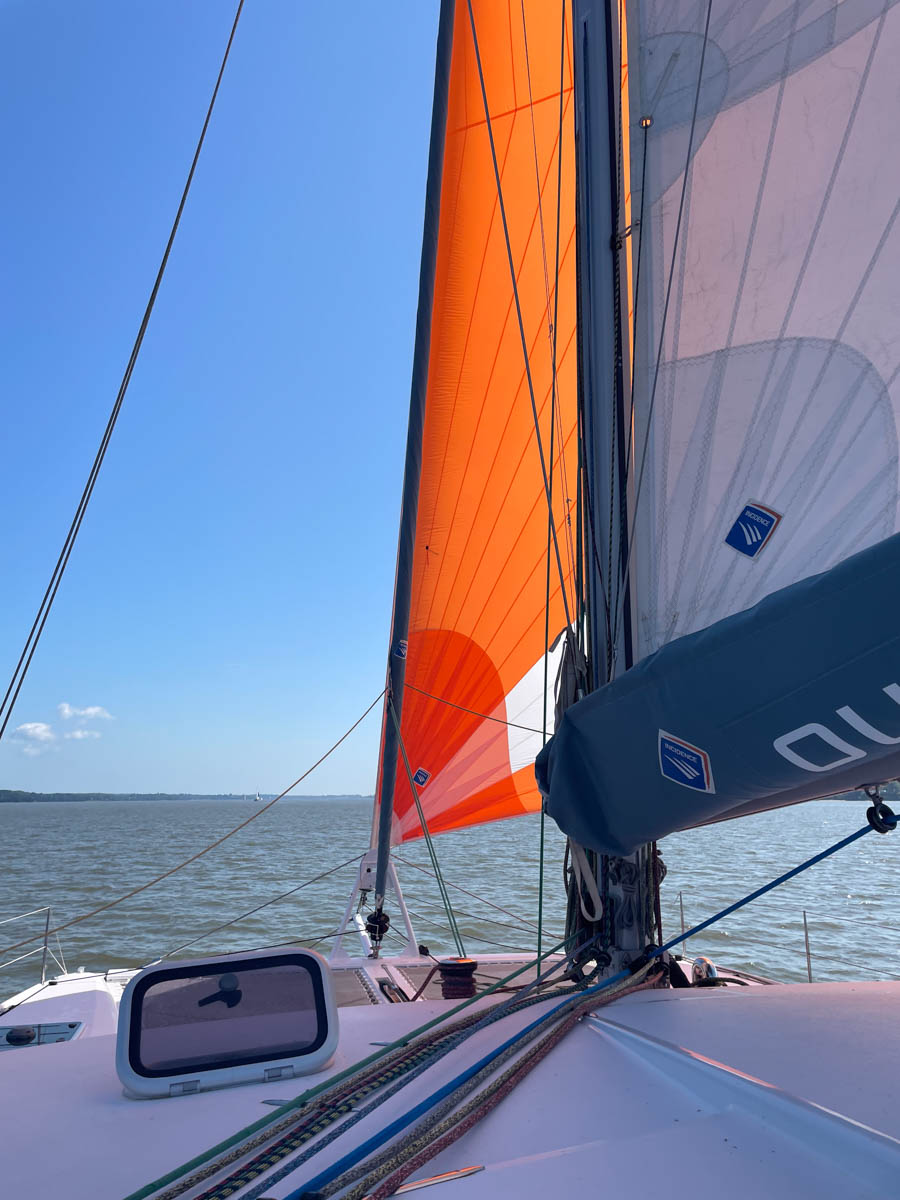 Nous longeons les plages où nous apercevons de nombreux vacanciers. Derrière la dune des maisons balnéaires se dessinent. Le vent tombe à un mille des digues de l’arrivée. Nous roulons le gennaker et allumons les moteurs. Matlo qui nous a rattrapé est plus courageux et finit tout à la voile. La zone de mouillage est à l’intérieur de la rivière, entre le chenal et la zone d’entraînement des Coast Guards, nous sommes un petit peu loin de la ville mais bien protégés. Ce soir nous dinons tôt à bord et les parents vont aller boire un verre en ville pendant que les enfants jouent sur Loela à Mario Kart avec les nouvelles manettes de Switch ; chacun est content de son moment entre eux.