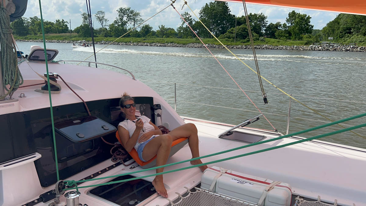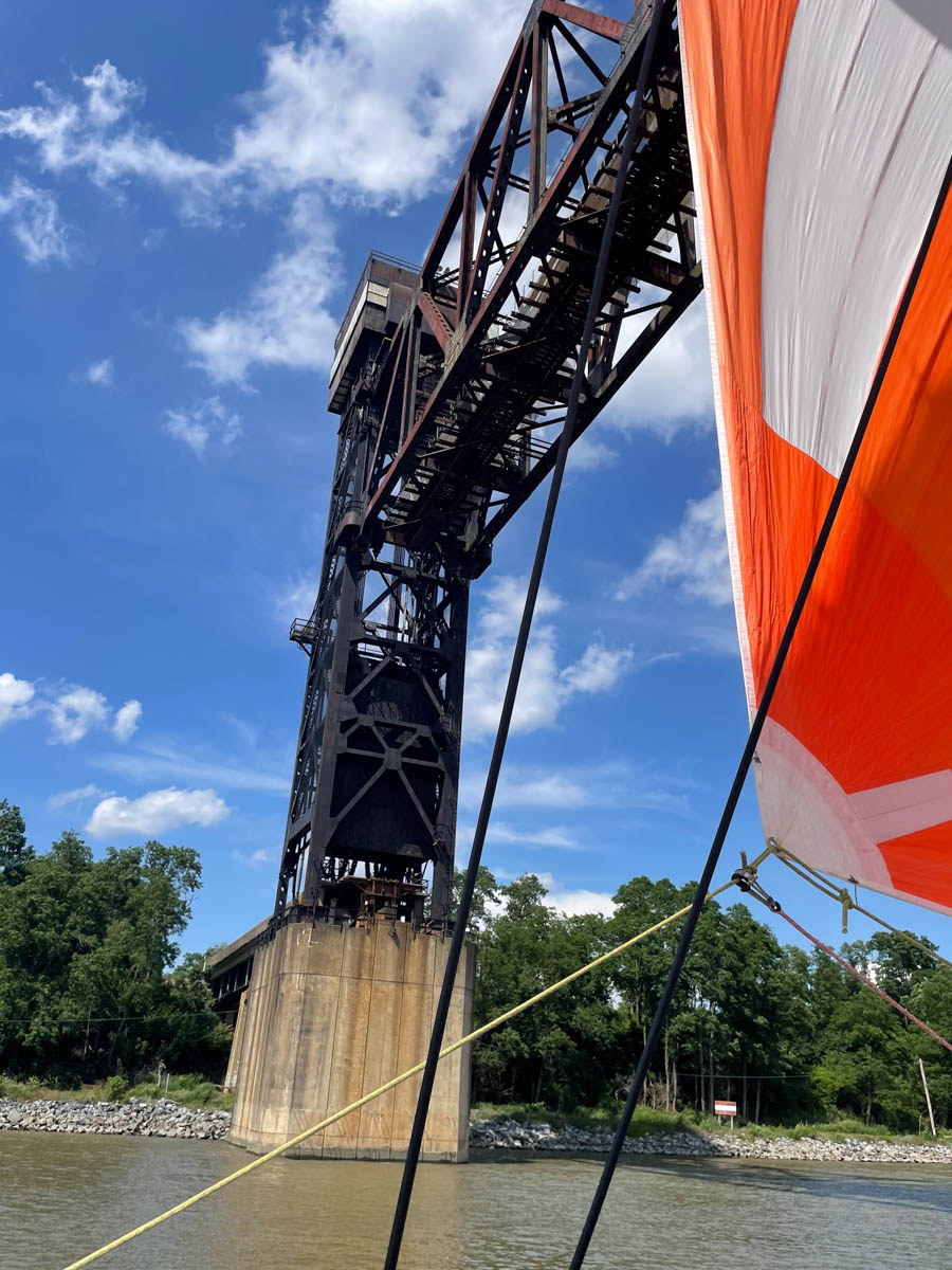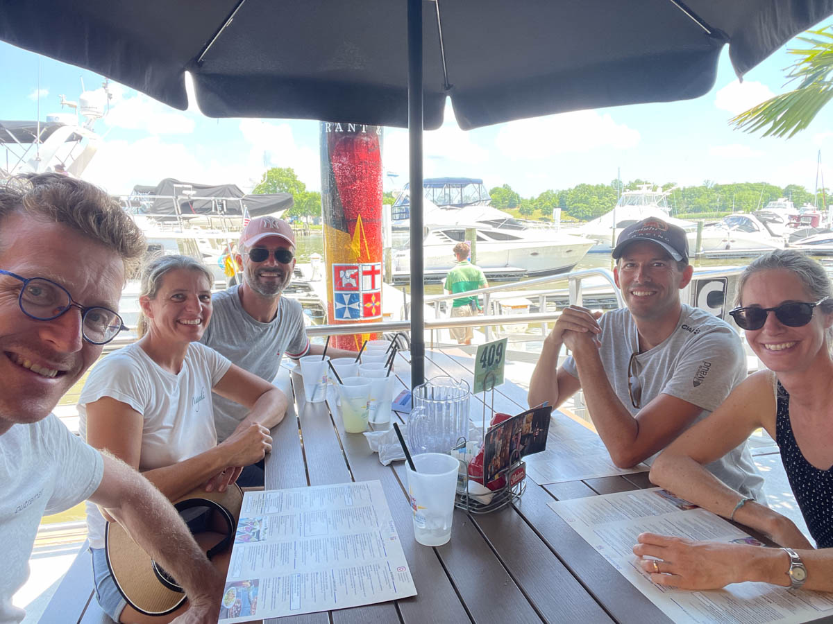 Nous rentrons dans le canal toujours sous gennaker, nous retrouvons nos sensations de régate de Corsaire en rivière avec le vent qui varie en force et en direction à chaque arbre ! Il faut rester juste patient : quand la voile se dégonfle, elle se regonflera très vite. Magali reste concentré sur le pilote automatique pour rester bien au milieu du canal. Vincent de Matlo, notre expert courant, nous avait bien prévu une aide supplémentaire jusqu’à 17h, nous avons le courant avec nous qui nous fait descendre tout seul. Jeremy de Solaine, notre expert apéro, nous a prévu une petite halte pour déjeuner. Au tiers du canal le petit port de Chesapeake City accueille les bateaux de passage soit sur un ponton municipal gratuit soit au mouillage au milieu du port. Solaine et Loela arrivés les premiers se mettent au ponton, Matlo jette l’ancre. Nous nous retrouvons à 13 au restaurant sous un soleil estival, nous dégustons un repas froid salade, tacos, sushi, pizza.