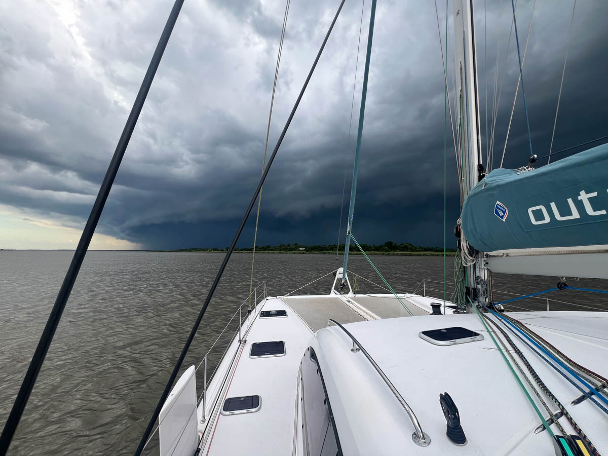 Martin va passer l’après-midi sur Matlo, il va pouvoir espionner et surtout jouer avec les copains. Nous continuons notre chemin le long du canal toujours au gennaker avec Magali a la barre. Antoine aide Mathilde à monter le circuit de bille que Grand-pa lui a offert pour son anniversaire. Nous passons chaque pont en se demandant s’il est assez haut mais tout va bien. Le vent est toujours complètement instable mais nous avançons encore à la voile. Il faut attendre le dernier pont pour enfin avoir un vent stable et plus soutenu, nous filons vers la sortie dans la Delaware Bay. Nous roulons alors le gennaker pour passer sous solent car nous devons nous glisser au près entre la côte et une ligne d’îlots et digues. Nous nous dépêchons de rejoindre la plus grande île Reedy Island et la côte avec de grands arbres pour jeter l’ancre. Le ciel derrière nous est tout noir et des orages violents sont annoncés sur zone avec des messages répétés à la VHF qui parlent même de tornades dans les terres. Nous les suivons au radar également.