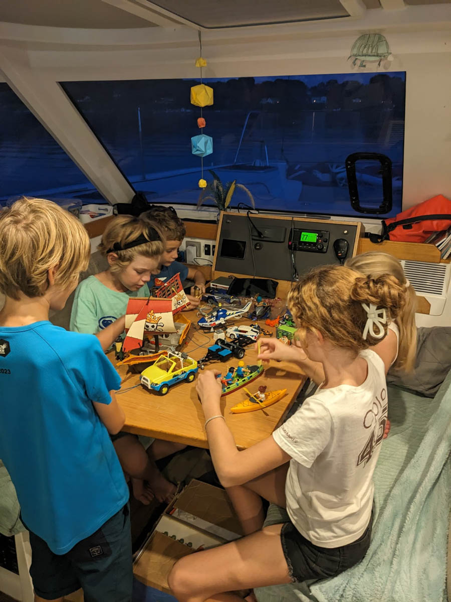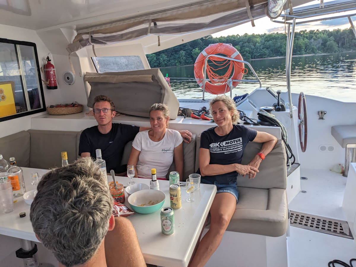 Arthur, Alice et Magali affalent le gennaker pour qu’il ne se déchire pas, nous ramassons tout ce qui traîne et Mathilde ferme toutes les fenêtres et le tour de cockpit. Nous jetons l’ancre sous les premières gouttes, nous mettons toute la chaîne (50 mètres) plus la pantoire pour être sûr de tenir dans les rafales. Le vent monte rapidement jusqu’à 40 nds. Le ciel est noir. Des éclairs éclatent autour. La pluie battante s’abat sur nous. Nous nous réfugions à l’intérieur les moteurs allumés au cas où nous déraperions et les appareils électroniques dans le four et la cocotte minute comme cage de Faraday. Heureusement ça se passe bien, tout se calme progressivement. La pluie s’arrête, nous aurions pu chercher Martin mais il est en pleine partie de Monopoly … il va falloir attendre 🤣. La bonne nouvelle c’est que l’orage a fait chuter la température qui était étouffante, nous dînons agréablement à l’intérieur.