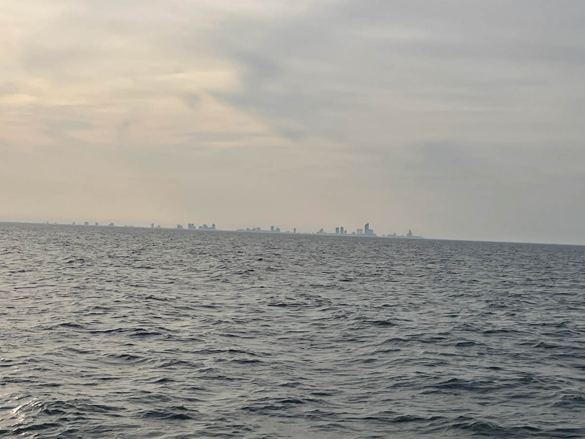 Vendredi 20 juin cap vers Cape May. Nous partons les derniers : avec 50 mètres de chaîne à nettoyer ça prend du temps, surtout qu’un gros pâté de glaise verte est collé à l’ancre … nous devons la gratter avec la gaffe et le jet d’eau ! Le vent de travers de 12nds fait filer Loela à son allure la plus rapide. Nous dépassons rapidement Solaine. Il faudra quelques temps sous gennaker pour doubler aussi Matlo. Nous filons sur cette mer sans vague. Quand nous contournons le cap, le vent tombe et des mouches piquantes arrivent en troupeau. C’est horrible, nous nous calfeutrons à l’intérieur… nous préférions limite les moustiques que nous claquions plus facilement car ces petites mouches sont très réactives