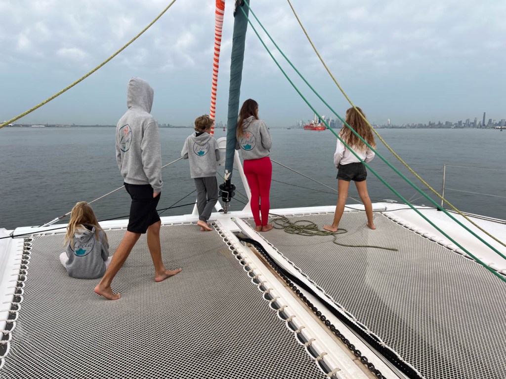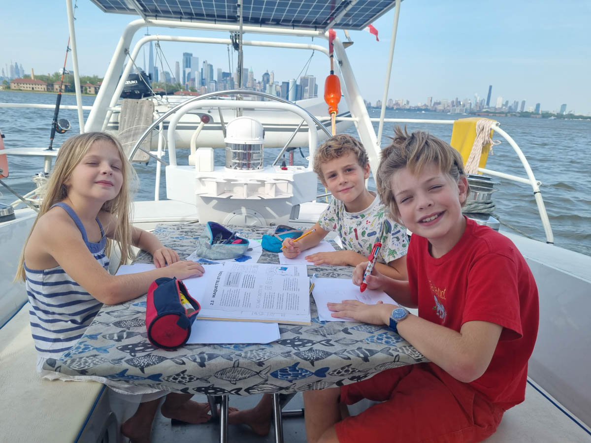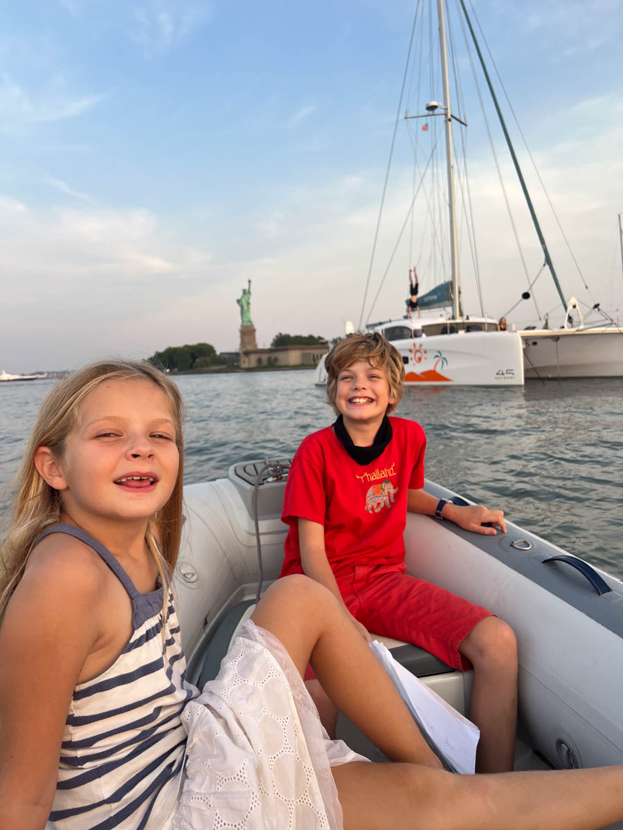 Antoine prend le premier quart car il pourrait y avoir des rafales. Ensuite Magali fait le quart du milieu de nuit. Il faut faire attention aux nombreux bateaux et cargos qui vont et viennent de la baie de New York. Les enfants prennent le dernier quart d’arrivée au lever du soleil. Nous gardons le gennaker jusque devant le fameux pont de Verazano qui marque l’entrée de la baie de New York. Il est 8h30 et nous sommes tous sur le pont pour apercevoir la skyline de New York City et la Statue de la Liberté🗽 . Le vent s’arrête sous le pont et nous continuons au moteur dans les nuages. Le ciel est gris et nuageux, la pluie menace mais nous restons dehors ébahis devant le spectacle qui s’offre à nous. Que c’est émouvant de voir les grattes-ciels qui se dessinent sur la presqu’île de Manhattan. Nous sommes comme les émigrants qui arrivaient il y a plus d’un siècle ! Maintenant le paysage a un peu changé, il y a des buildings qui se sont construits sur Brooklyn et sur Jersey City.