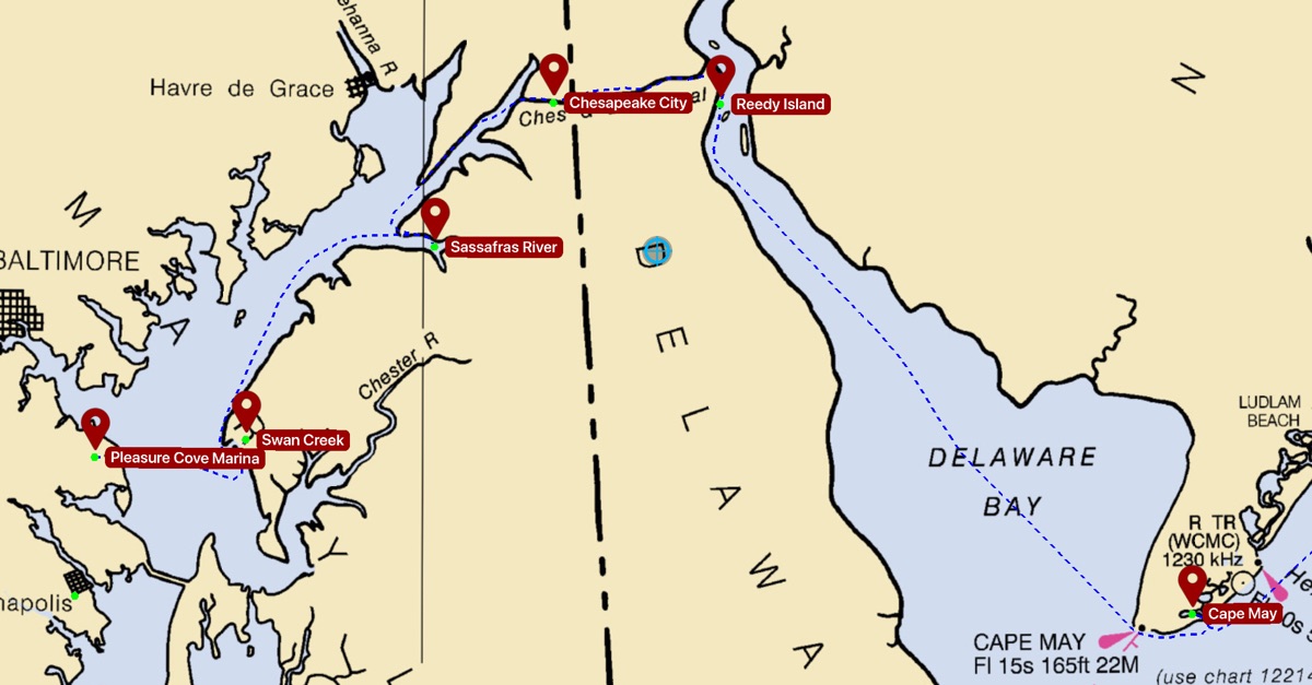 Jeudi 19 juin départ à 8h de Sassafras River pour pouvoir passer le canal entre la Chesapeake Bay et la Delaware Bay avec le courant descendant. Le vent se lève à 10 nds, nous pouvons mettre les voiles et même le gennaker : que ça fait du bien de ne pas entendre le moteur ! Par contre il faut rester attentif aux bouts de bois flottants, nous ne voudrions pas abîmer notre belle coque fraîchement réparée.