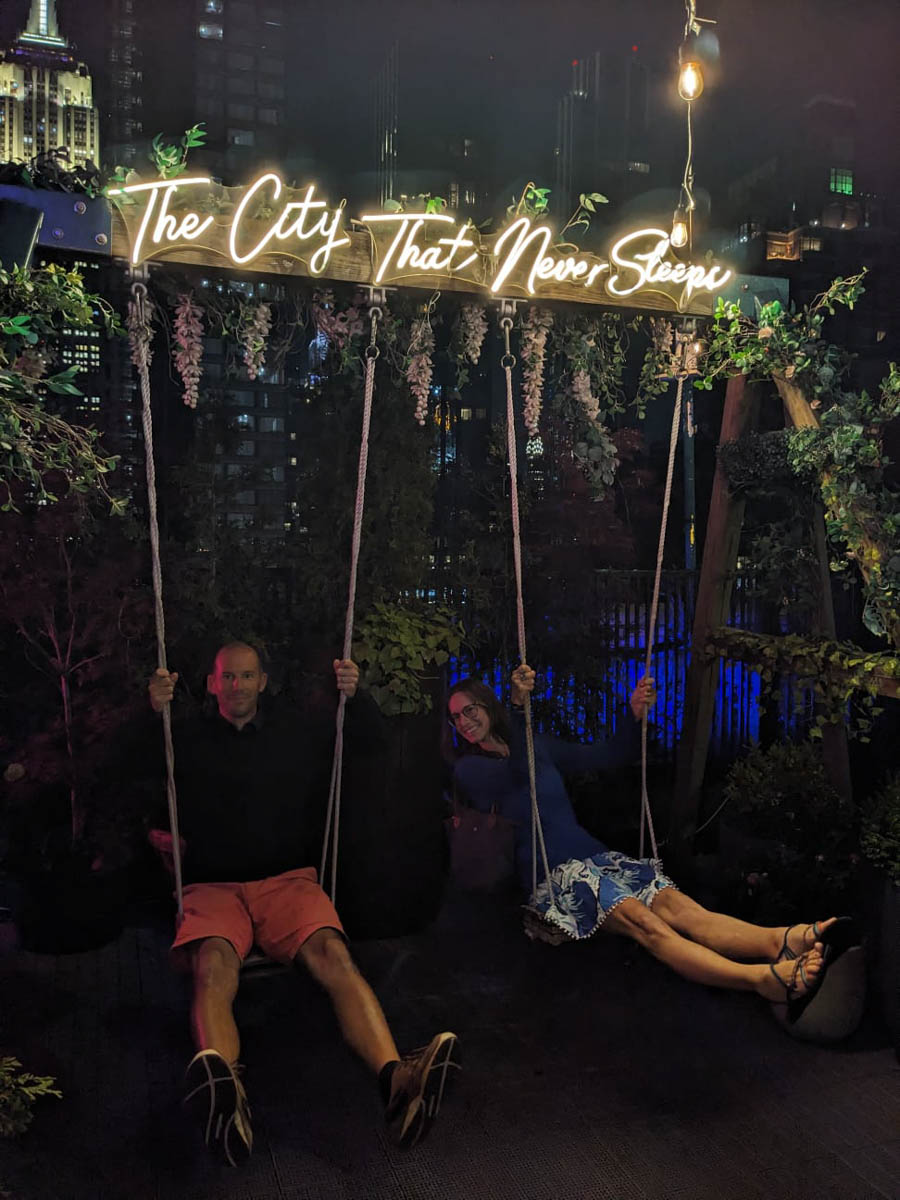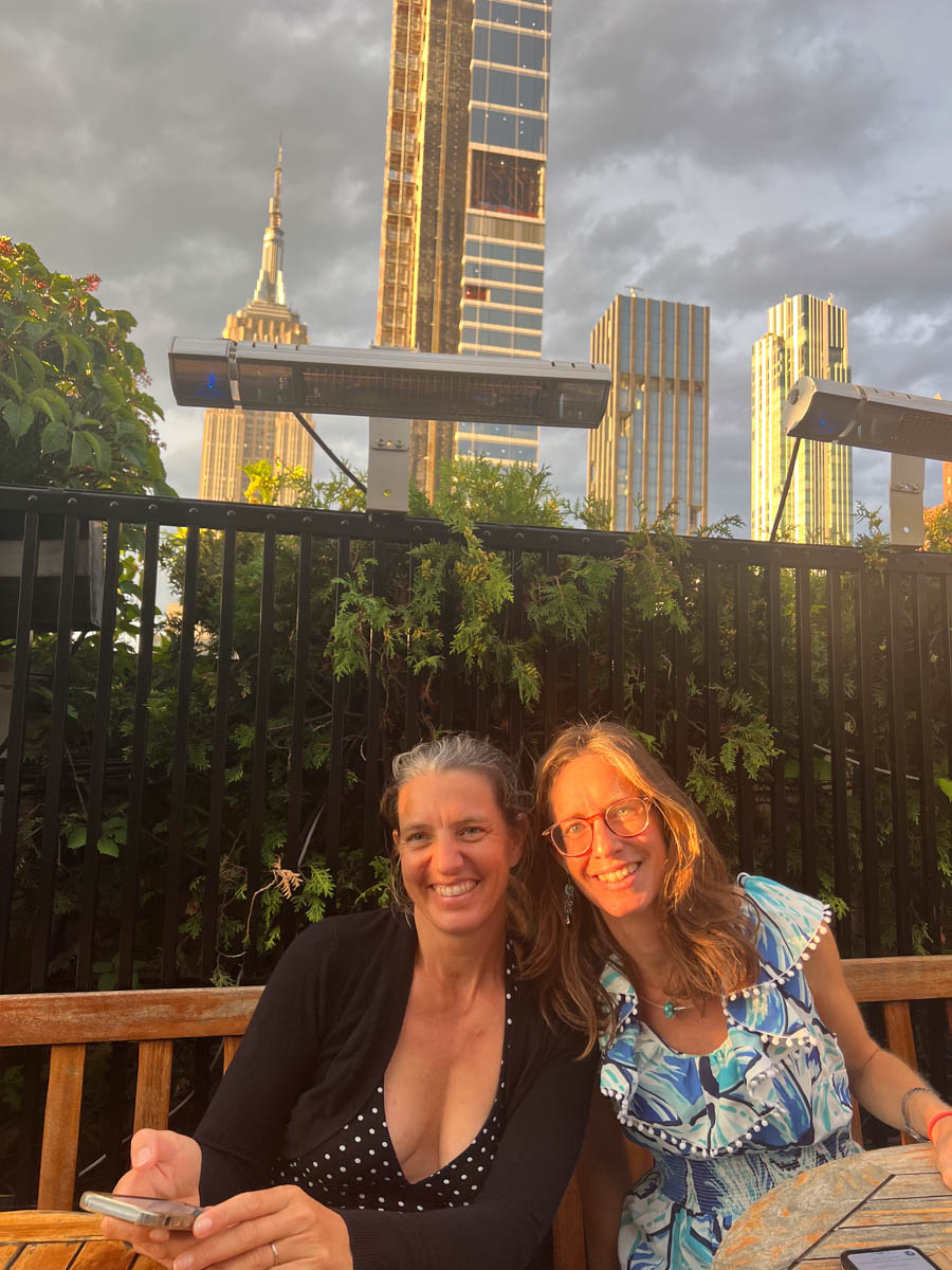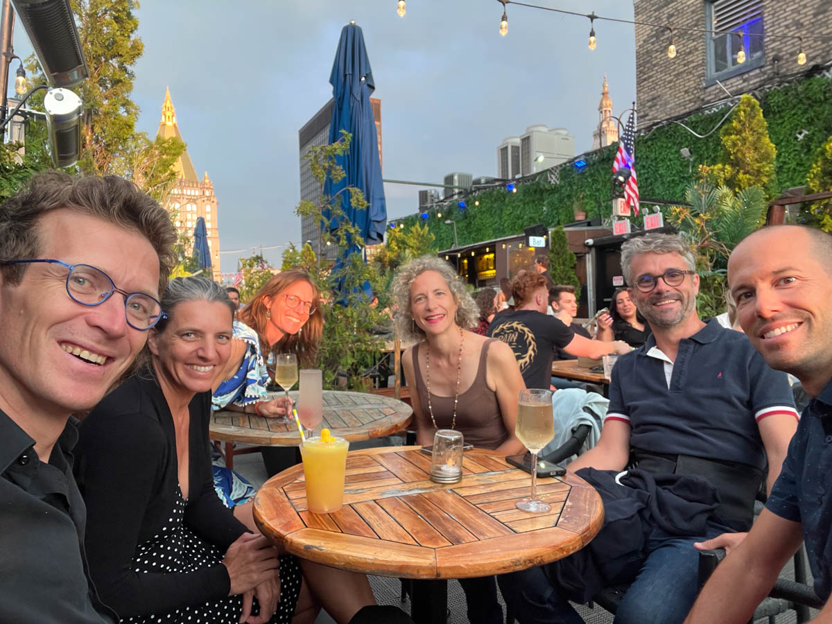 Le soir c’est notre dernière soirée avec les copains. Mathias et Loris viennent sur Loela pour dîner et jouer à MineCraft à 4. Les parents ont rendez-vous sur le rooftop du 230 Fifth avenue. Nous avions réservé nos entrées pensant qu’il y aurait foule en cette veille de jour férié. Finalement l’orage a du en dissuader beaucoup car nous rentrons sans problème. Sur le toit terrasse la vue sur New York au pied de l’Empire State Building est magnifique. Avec Jeremy, Delphine, Vincent et Céline nous apprécions l’apéro et le dîner au soleil couchant, notamment le dessert en forme de mini chariot de glacier. La musique est super sympa et tout à fait de notre âge : nous dansons un petit peu mais l’espace est surtout accaparé par des tables. Il est presque 2h quand nous disons au revoir Jeremy et Delphine en se promettant de se retrouver en France. Nous décidons avec Céline et Vincent de tester le métro de nuit. Il roule toute la nuit mais en omnibus et en s’arrêtant longtemps à chaque station. Nous arrivons au bateau à 3h30!