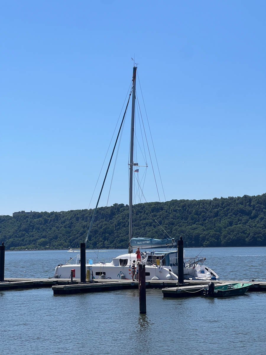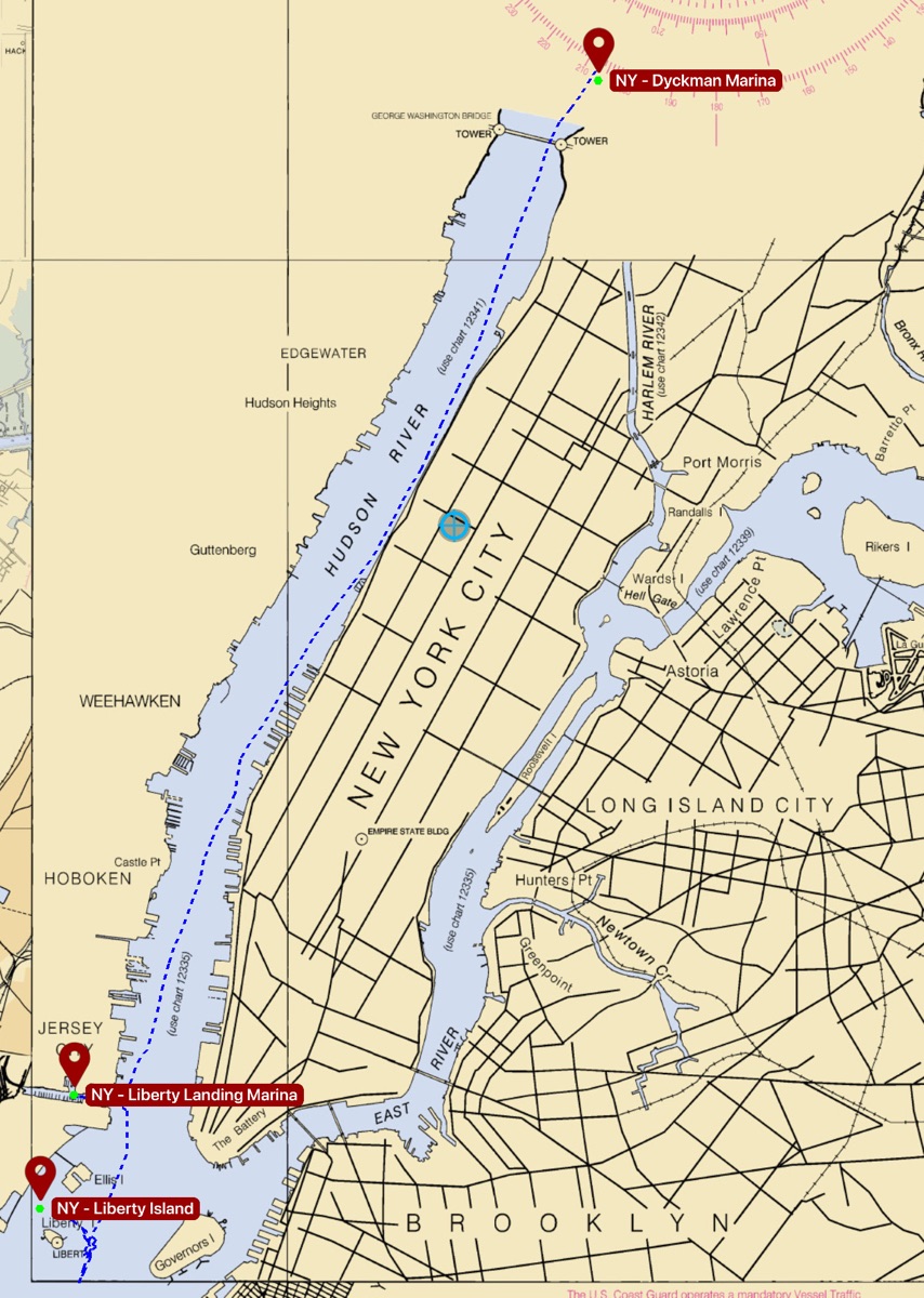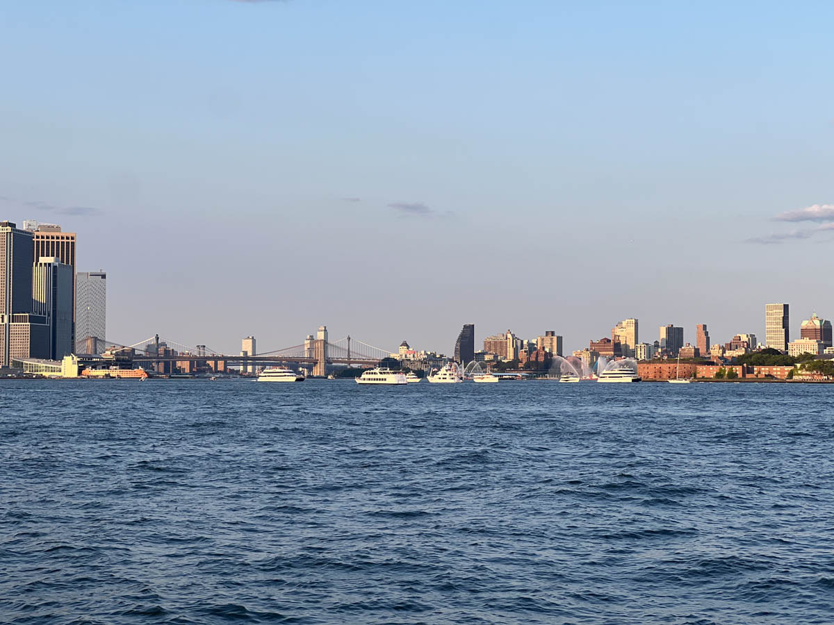 En descendant l’Hudson River nous profitons une dernière fois de la vue sur les immeubles New-yorkais que maintenant nous reconnaissons sans problème. Nous récupérons Camille et Margot à la marina de Liberty Landing où nous remplissons aussi le réservoir de gasoil à ras bord. Nous mouillons ensuite devant la Statue de la Liberté dans l’axe de Brooklyn Bridge pour être en position pour le fameux feu d’artifice offert aux New-yorkais par Macy’s.