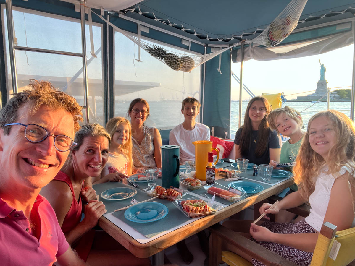 Vendredi 5 juillet jour du départ : après le petit déjeuner tardif nous faisons une séance photo d’au revoir à New York. Puis nous déposons Camille et Margot au quai du parc. De grosses embrassades et la promesse de nous revoir en France ou aux USA. Arthur ferait bien un stage d’anglais après son bac l’année prochaine 😉
