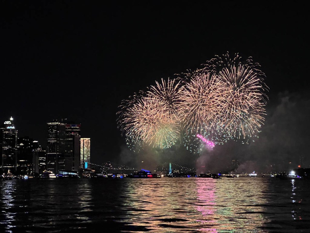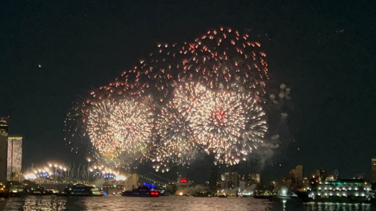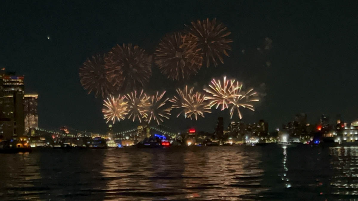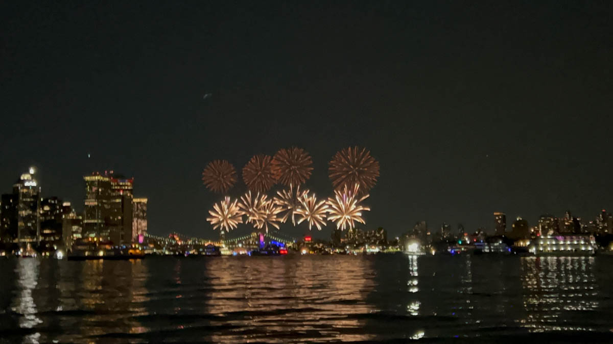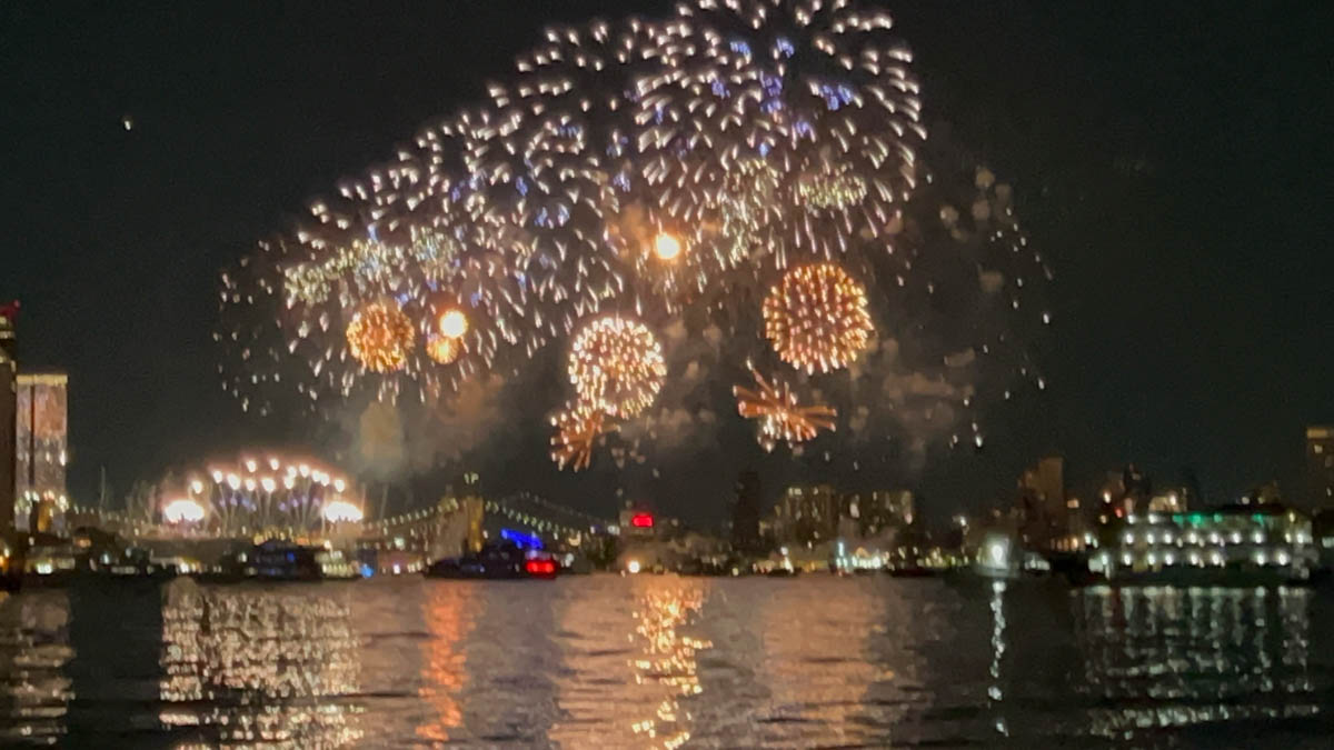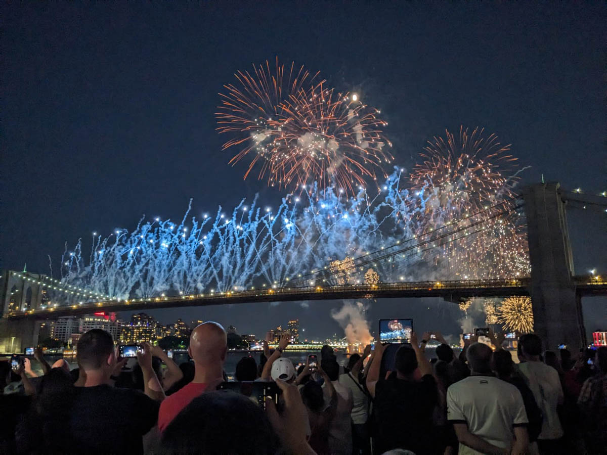 Nous dînons des sushis amenés par Camille en admirant le coucher de soleil sur la Statue et sur la skyline. Tout ce que la baie de New York compte de bateaux de croisières, y compris les ferries de Liberty Island, sont chargés à ras bord de passagers et se mettent en place dans la zone qui leur est réservée entre Battery Park et Governor Island mais ils ne nous bouchent pas la vue. À partir de 21h des feux d’artifice éclatent partout autour de la baie, nous les voyons au loin. Et à 21h25 les festivités de New York City commencent : il y a un feu d’artifice sur le pont de Brooklyn et un autre sur l’Hudson River. Nous ne savons plus où regarder mais celui de Brooklyn remporte tous les suffrages. Il est absolument magnifique, tiré à partir de 4 barges et du pont lui-même.